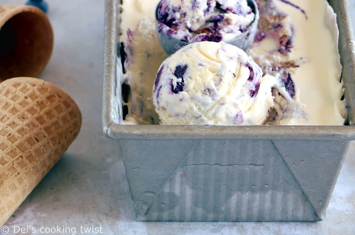 J’ai ici décliné cette base de crème glacée en l’agrémentant d’un coulis de myrtilles et d’un peu de purée d’amande. Le résultat est incroyablement crémeux, délicieusement fruité, avec une petite touche de croquant qui rend cette glace tout simplement irrésistible.