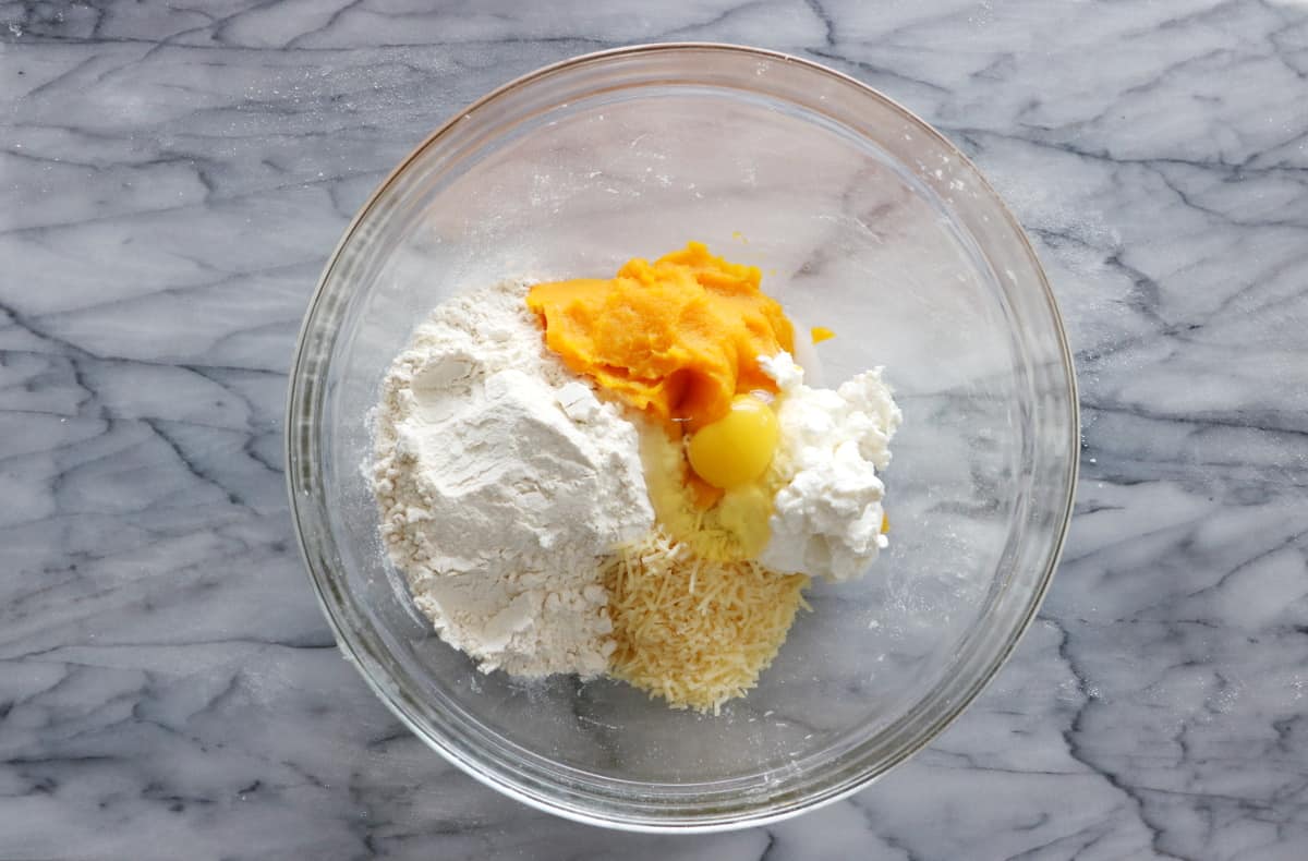 - Dans un saladier, mélanger à l’aide d’une cuillère en bois la purée de courge, la ricotta, l’oeuf, la farine, le parmesan râpé, le sel et le poivre. La pâte doit être souple et légèrement collante tout en se détachant des parois et formant une boule. Si la pâte est un peu trop collante, ajouter un peu de farine (mais ne pas trop en mettre surtout).