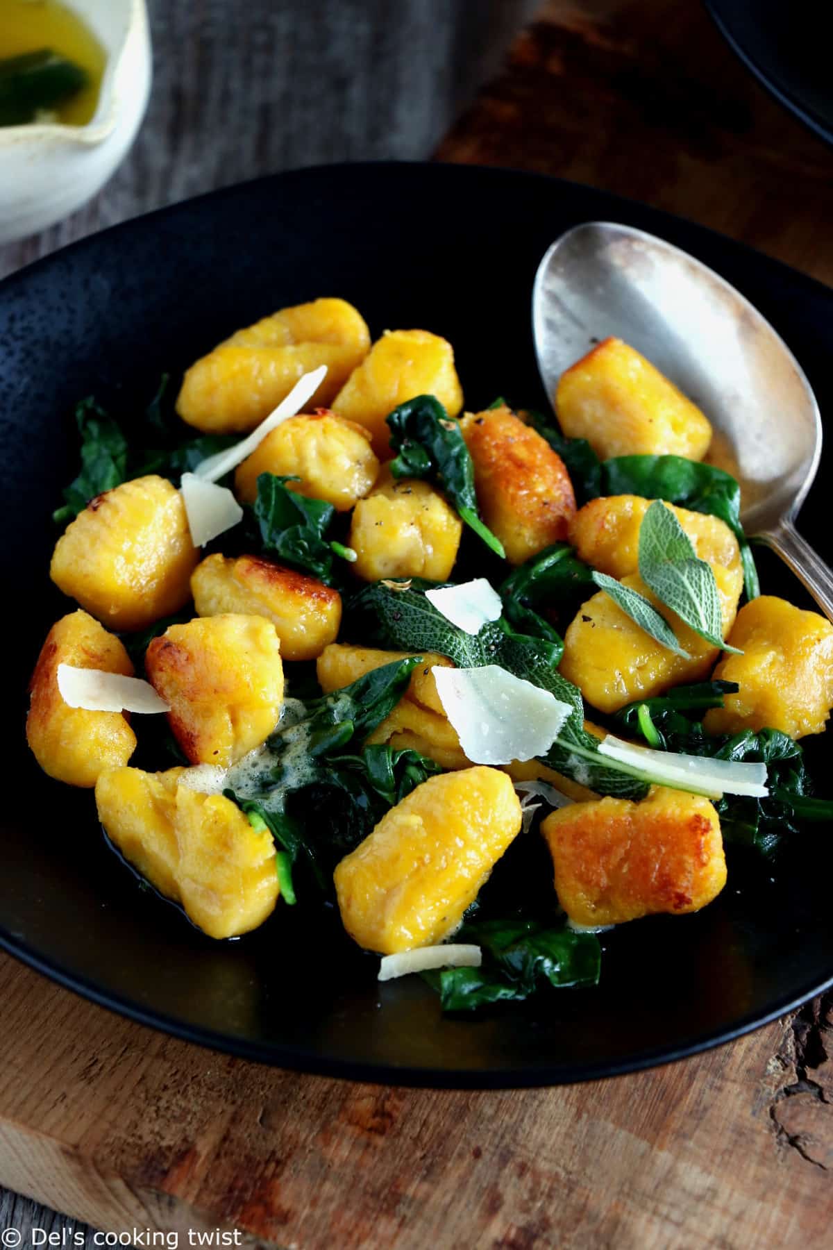 Je sers ensuite mes gnocchis avec une simple sauce au beurre citronné, de la sauge fraîche et quelques extras (j’ai ici utilisé un peu d’épinards frais). Saupoudrez d’un peu de parmesan râpé, de zeste de citron éventuellement et dégustez sans plus attendre.