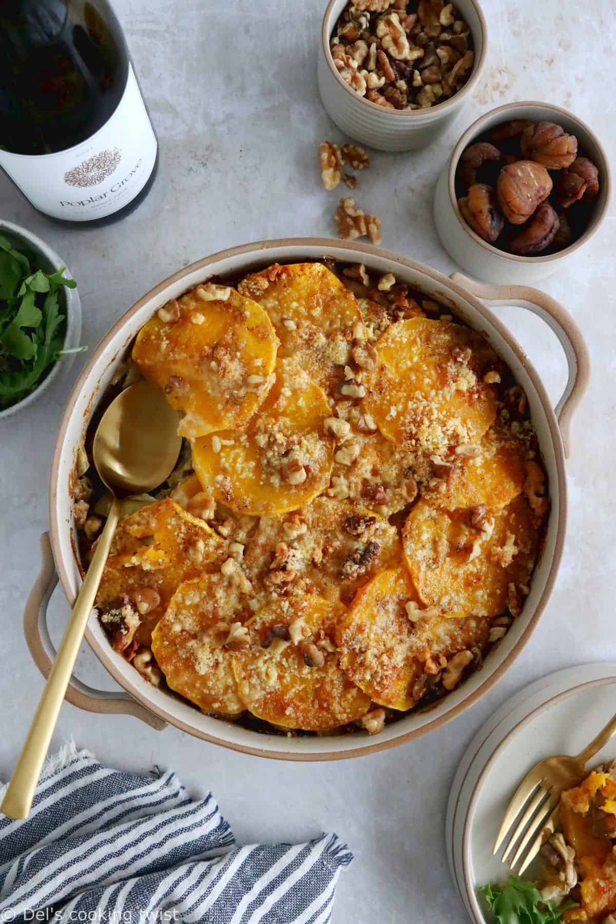 Ce gratin de courge musquée aux châtaignes et poireaux constitue un merveilleux accompagnement ou plat végétarien unique pour les fêtes ou pour une soirée entre amis. On y retrouve des saveurs chaleureuses et réconfortantes, avec un petit air festif très plaisant.