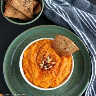 Il est toujours bon d’avoir une recette de hummus classique sous la main, mais j’aime varier les plaisirs. Mes versions préférées sont le hummus de chou fleur avec des chips de pain pita (original et pourtant tellement bon !) et le hummus aux poivrons grillés, un classique pour moi, puisque j’ai dû le réaliser des dizaines et des dizaines de fois, parfois en interchangeant le poivron par des carottes rôties au four. Une alternative qui fonctionne aussi très bien.