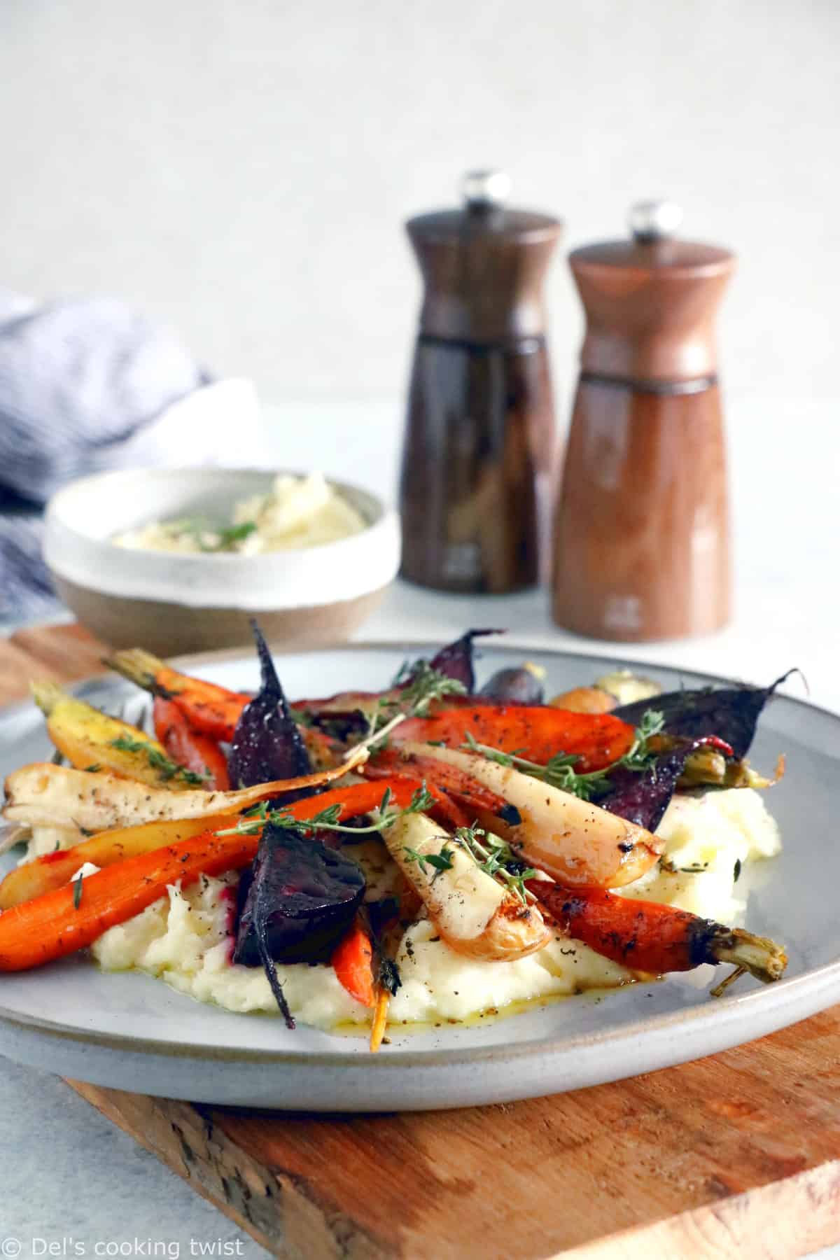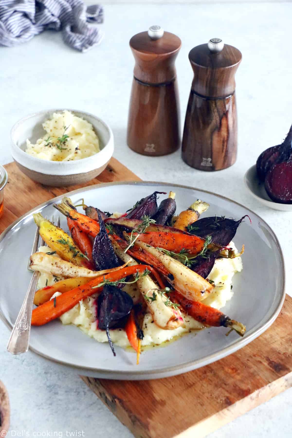 - Servir la purée de panais avec les légumes racines à l’érable, en parsemant de thym et de romarin supplémentaire. C’est prêt !