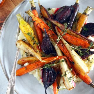 Vous pouvez servir les légumes racines rôtis à l’érable tels quels ou bien avec la purée de panais. Pour ma part, j’aime tout particulièrement cette deuxième option de par le contraste de textures offert. De plus, cela permet de compléter le plat qui peut alors se servir en plat végétarien unique plutôt qu’en simple accompagnement.