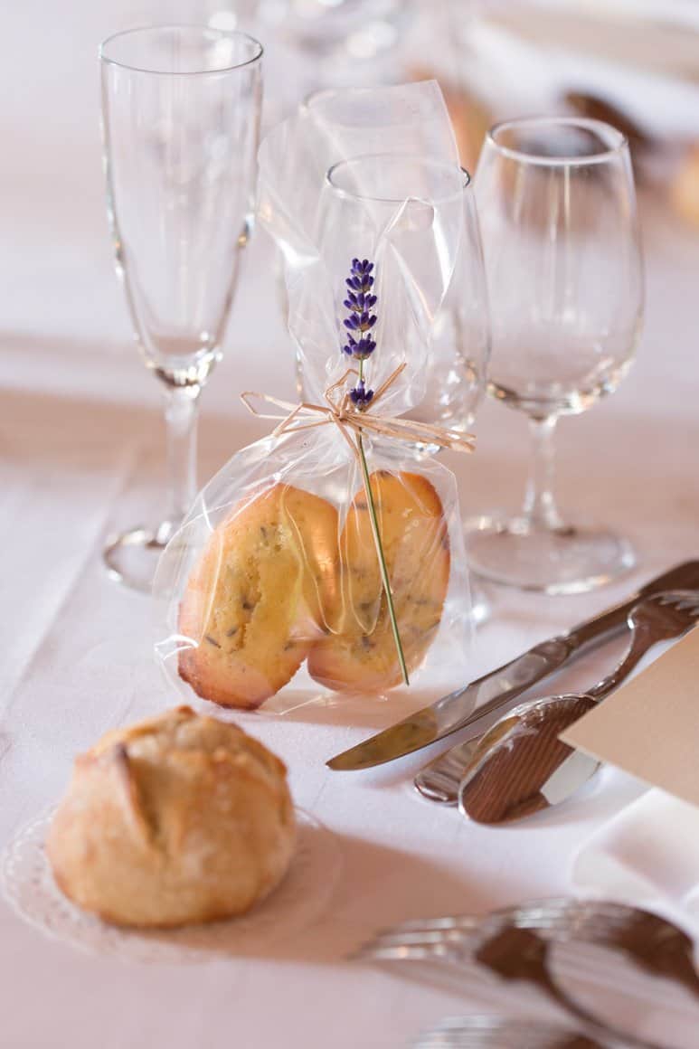 J’ai d’abord eu l’idée de les préparer moi même, avant de me rendre à l’évidence et d’accepter que ce projet serait difficile, d’autant qu’il est important que les madeleines soient consommées le plus frais possible. Ma chance a été de connaître une femme cake designer extrêmement douée en Touraine, Emilie de l’atelier de pâtisserie créative Sweet Mama. Elle a accepté de réaliser mes petites madeleines pour nos invités, y mettant tout son amour dans chaque petit sachet joliment décoré avec un brin de lavande.