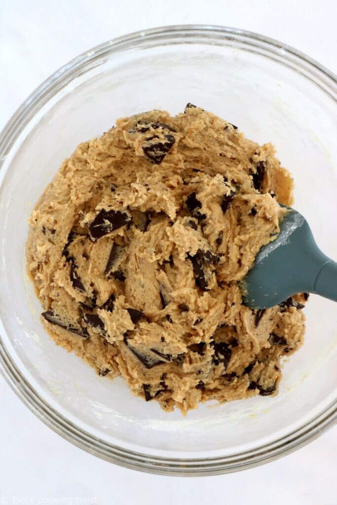 - Verser les ingrédients secs en deux ou trois fois, en mélangeant avec une maryse. Incorporer le chocolat coupé en morceaux* et mélanger jusqu’à ce qu’ils soient bien répartis dans la pâte.