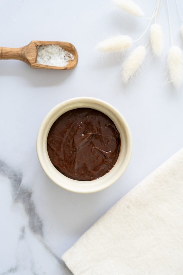 - Faire fondre le beurre et le chocolat dans une petite casserole placée sur feu doux en remuant régulièrement, jusqu’à l’obtention d’une texture lisse et douce. Cette étape peut aussi être réalisée au micro-ondes. Ajouter une pincée de fleur de sel si utilisation de beurre doux (pas besoin avec du beurre demi-sel).