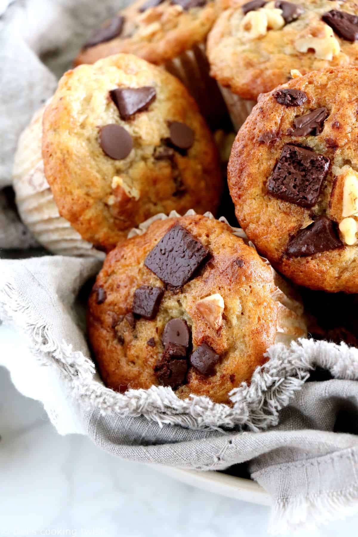 À la fois dodus et bien moelleux, ces muffins façon banana bread sont garnis de pépites de chocolat et feront un goûter très gourmand.