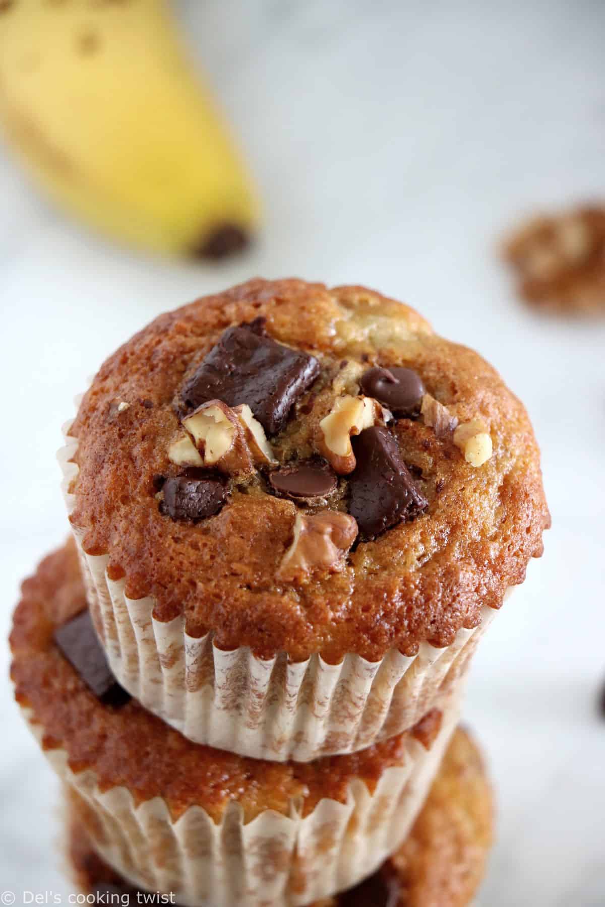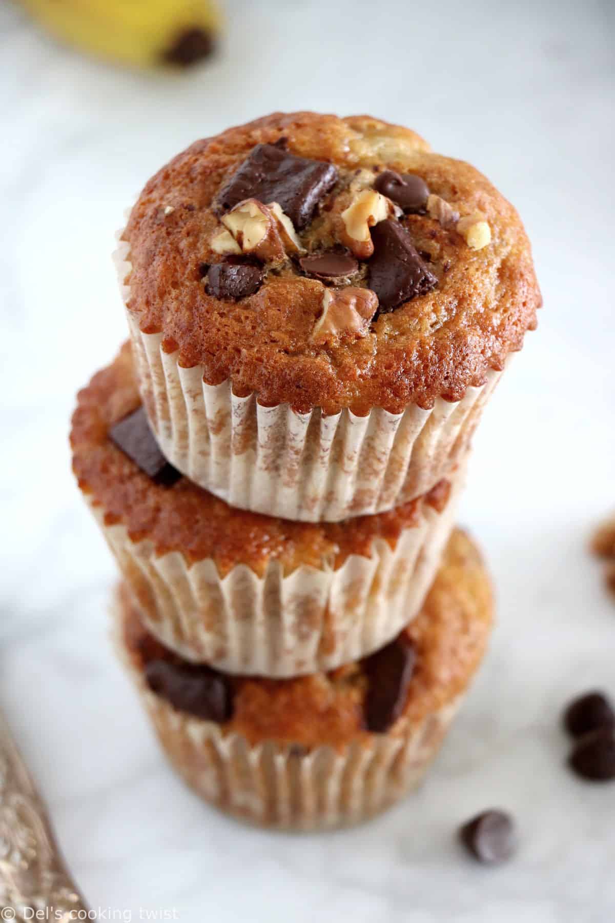 Ce sont de loin les meilleurs muffins à la banane et aux pépites de chocolat que vous puissiez imaginer. À la fois dodus et bien moelleux, ces muffins façon banana bread sont garnis de pépites de chocolat et feront fondre les gourmands au petit déjeuner comme au goûter.