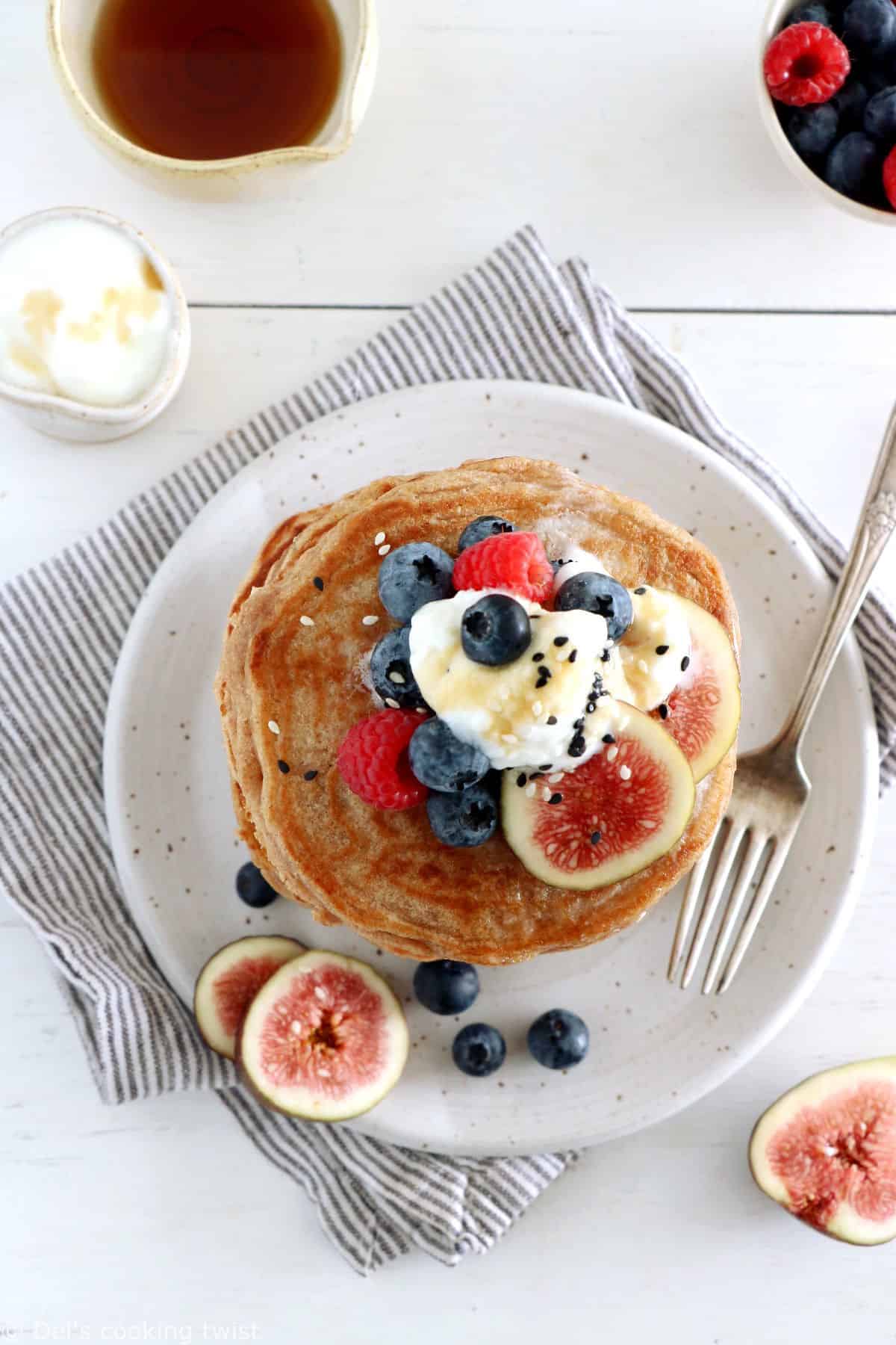 Encore une recette de pancakes par ici ! Au vu du succès de mes pancakes américains très moelleux (recette facile et inratable) ainsi que de mes pancakes à la banane que vous êtes de plus en plus nombreux à faire et à refaire chaque week-end, j’ai choisi d’ajouter un autre classique à mon répertoire : des pancakes réalisés avec de la farine complète.