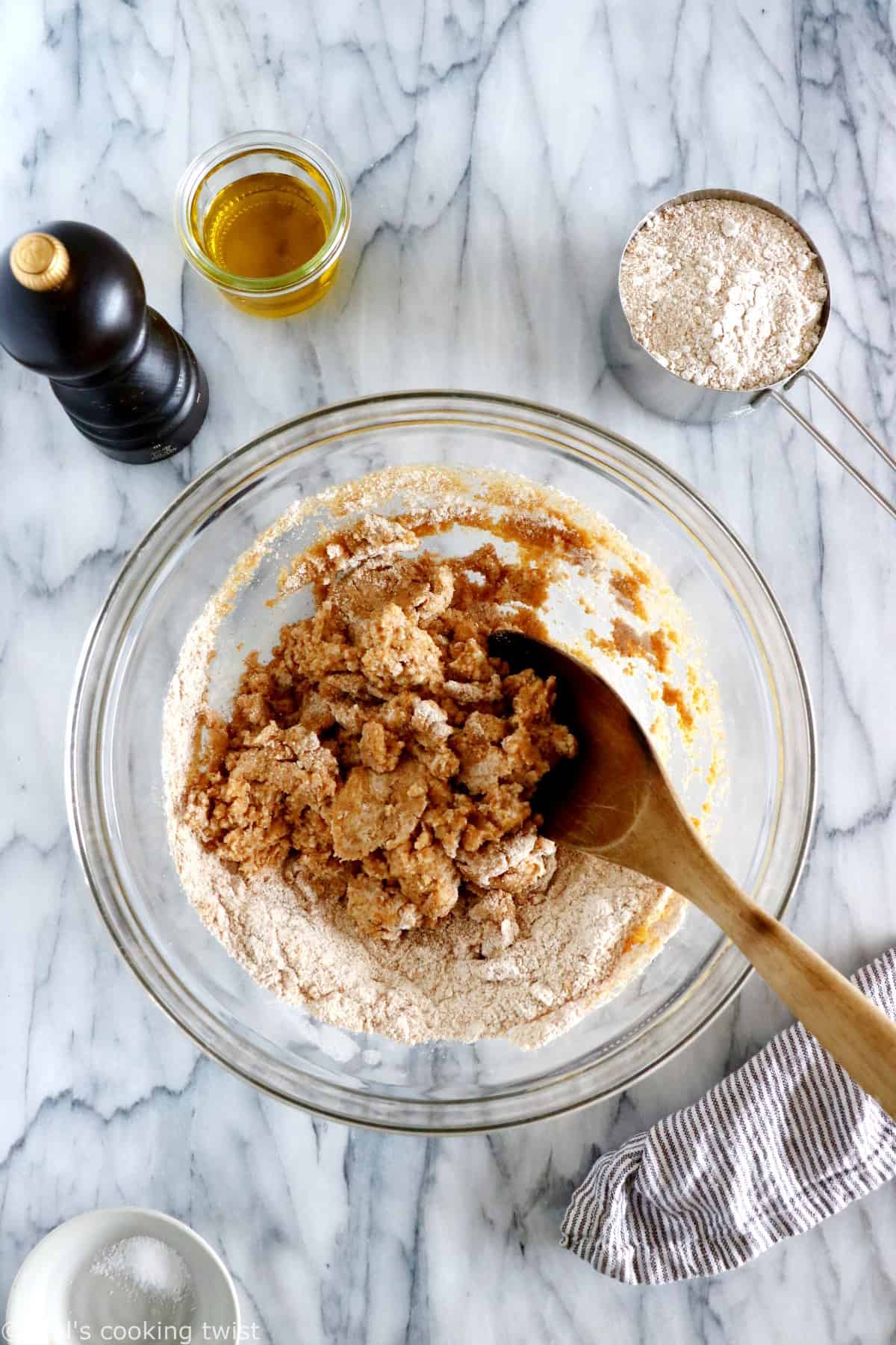 1. Ajouter la farine complète dans un saladier et faire un puits en son centre.