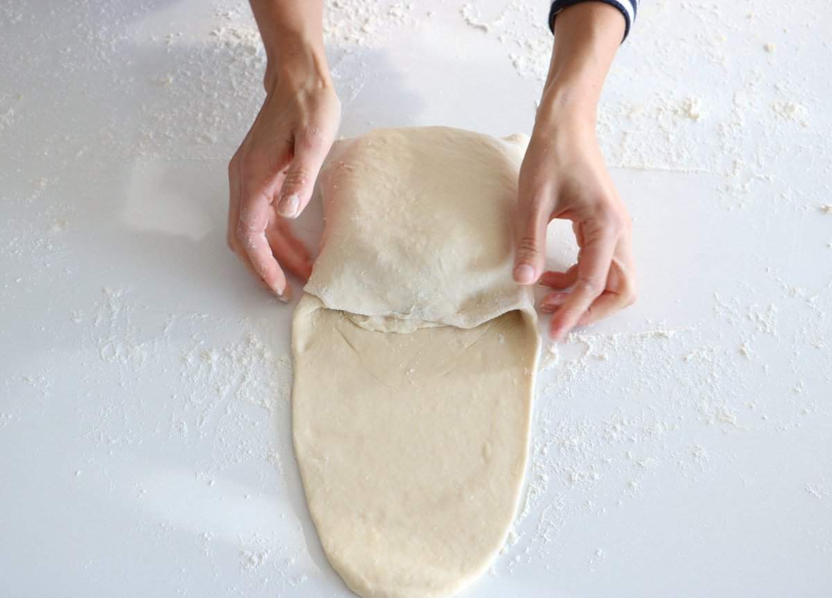 4. Pour le 1er tour: à l’aide d’un rouleau à pâtisserie, tapoter doucement le pâton de manière à répartir la matière grasse équitablement sans percer le pâton, en formant une longue langue de pâte. Abaisser ensuite la pâte sans forcer pour éviter que la pâte encore fragile ne se déchire. Plier l’abaisse en 3 parties égales (replier une extrémité de l’abaisse sur elle-même, puis replier l’autre extrémité sur les deux premières). Bien souder les 3 épaisseurs de l’abaisse. Le premier tour est ainsi terminé.