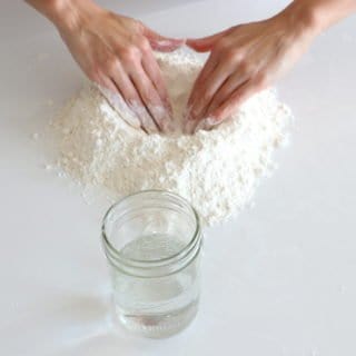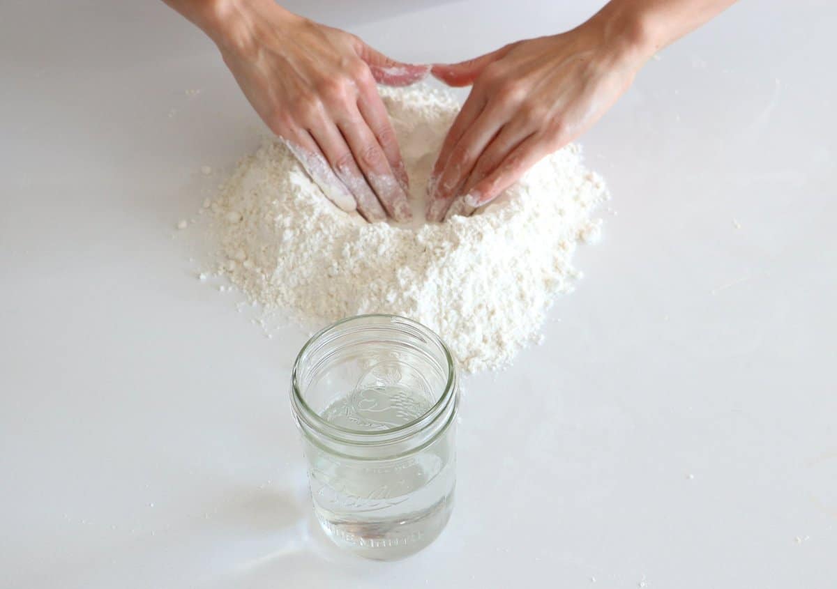 2. PÂTE FEUILLETÉE : sur une surface de travail propre, verser la farine additionnée de sel et former un puits. Verser l’eau en son centre, puis du bout des doigts incorporer progressivement la farine par un mouvement délicat et circulaire. Ramener la farine restante en râclant la surface du plan de travail jusqu’à l’obtention d’une pâte compacte et peu travaillée (limitant ainsi le développement du gluten et de l’elasticité).