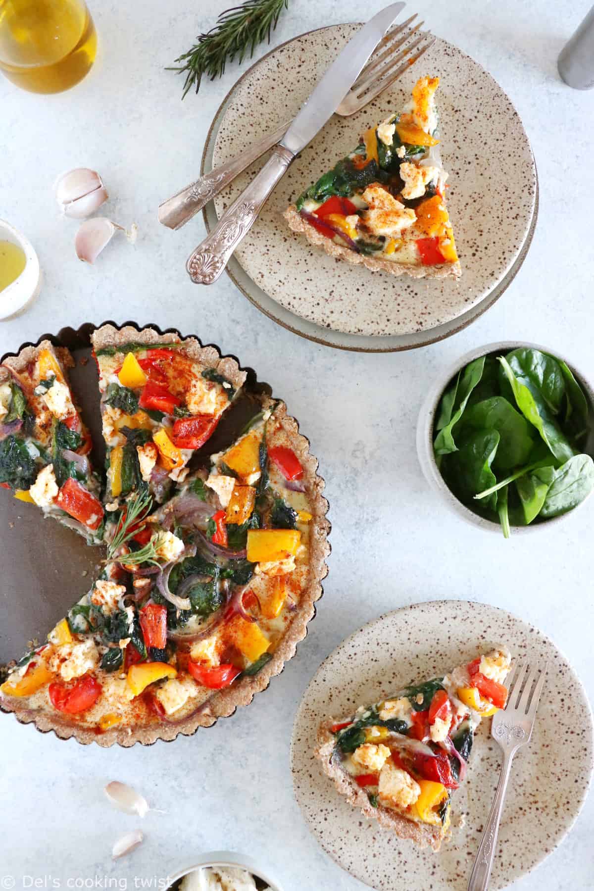 L’été s’invite dans notre assiette avec cette quiche aux légumes du soleil et à la feta qui met à l’honneur des saveurs colorées sur fond de pâte la farine complète et à l’huile d’olive.