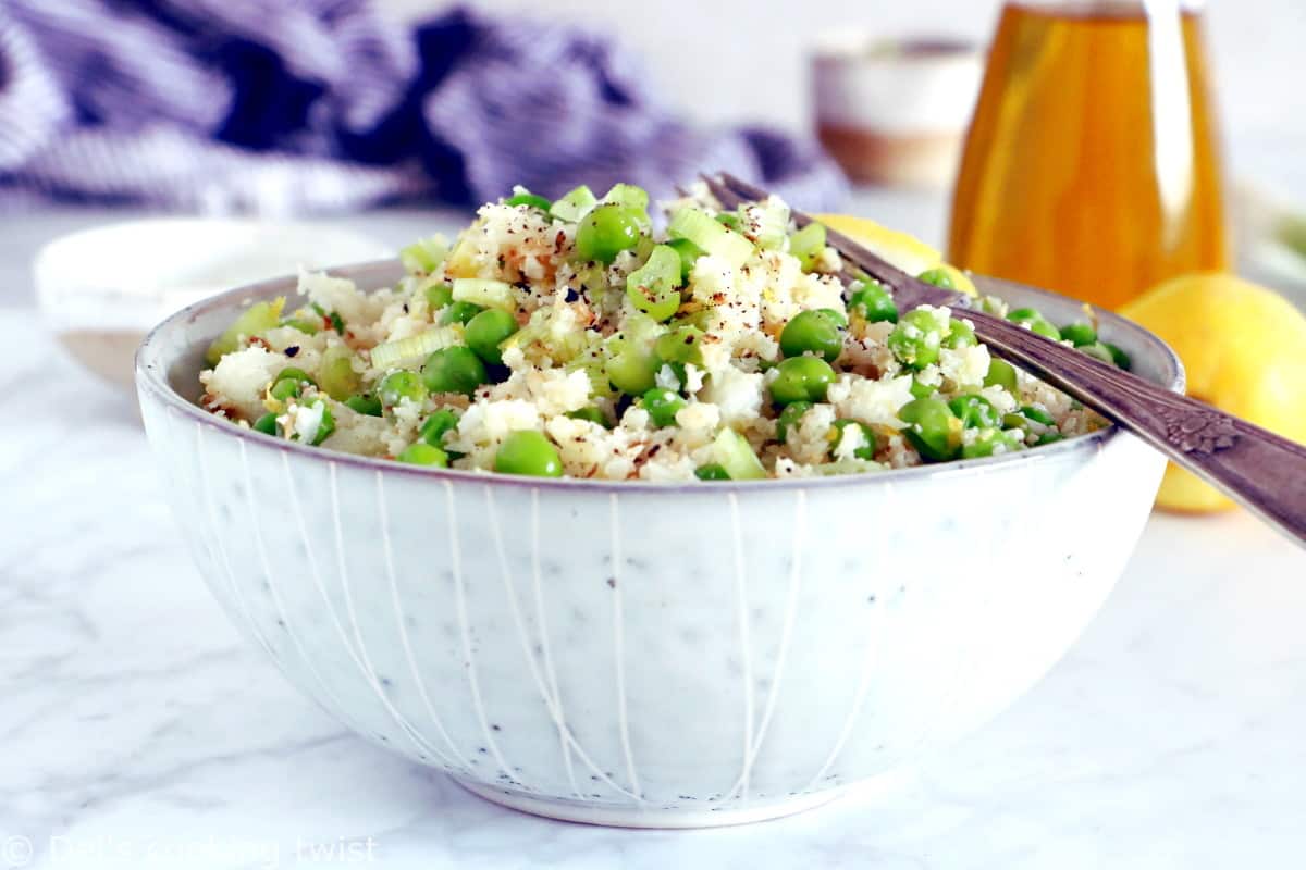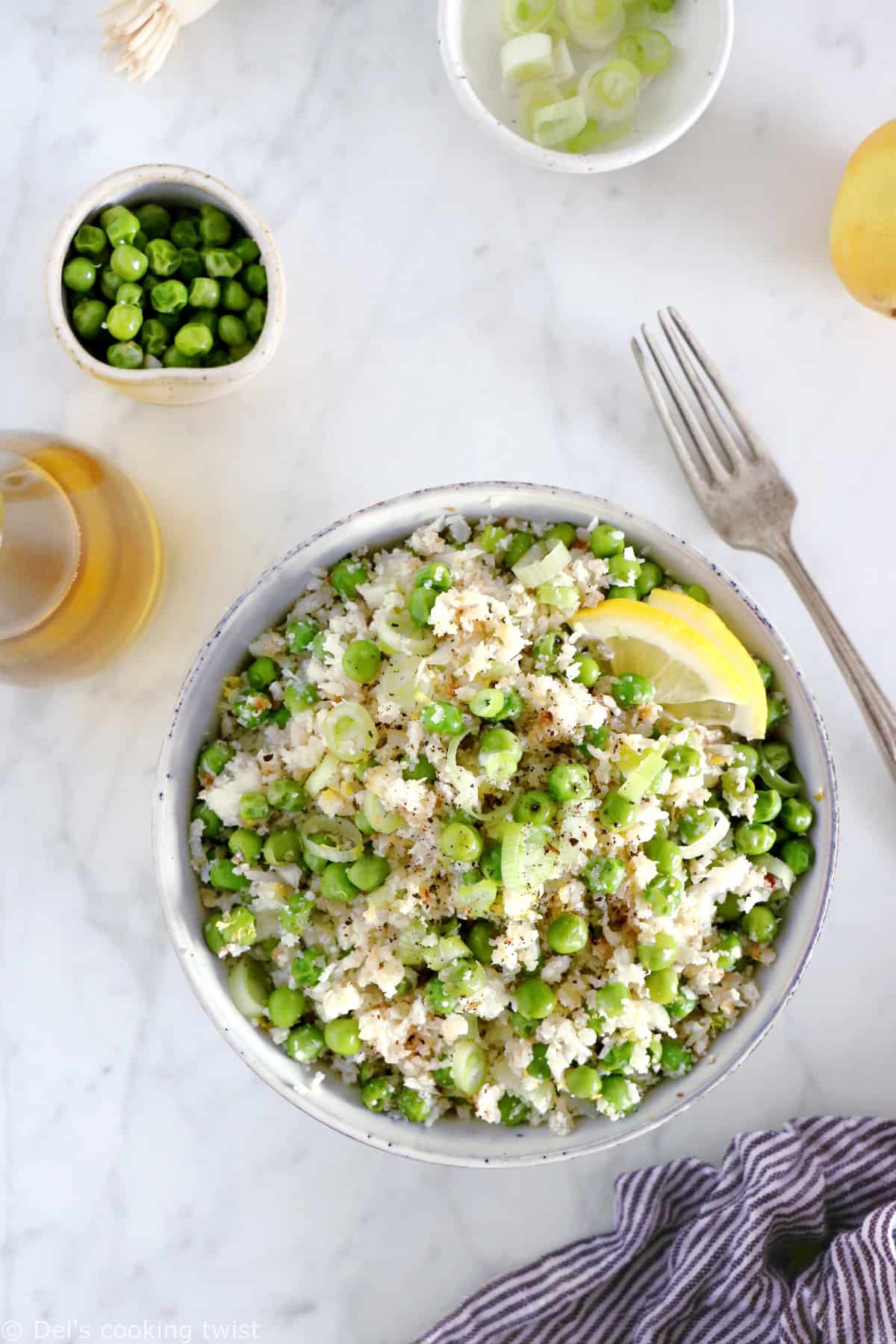 - Faire chauffer une cuillère à soupe d’huile d’olive dans une large poêle placée sur feu moyen. Lorsque la poêle est chaude, ajouter le riz de chou-fleur, les petits oignons de printemps ciselés, les petits pois et faire sauter pendant 5-7 minutes, en remuant souvent. Saler, poivrer, puis ajouter le zeste de citron et un filet de jus de citron. Mélanger, c’est prêt !