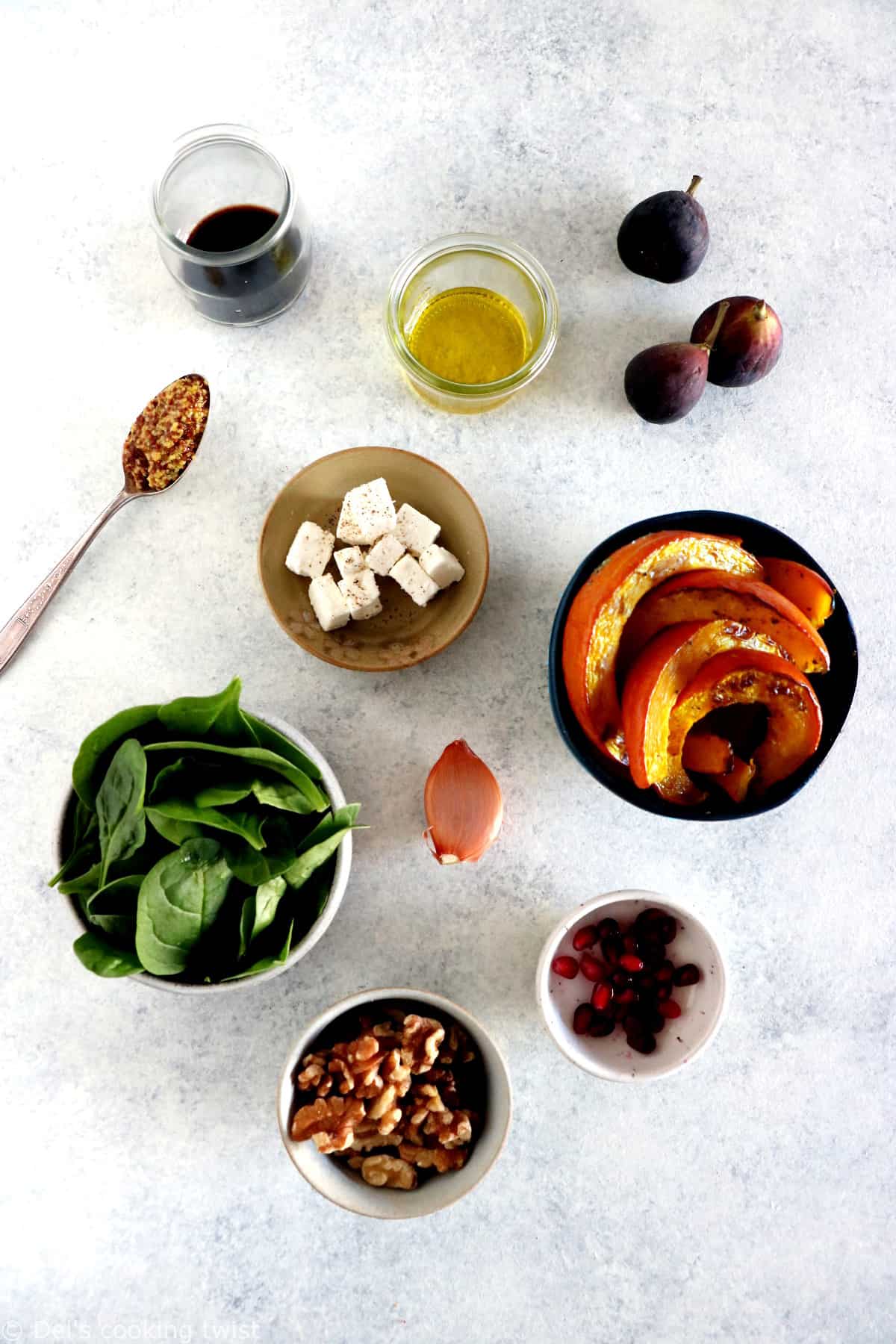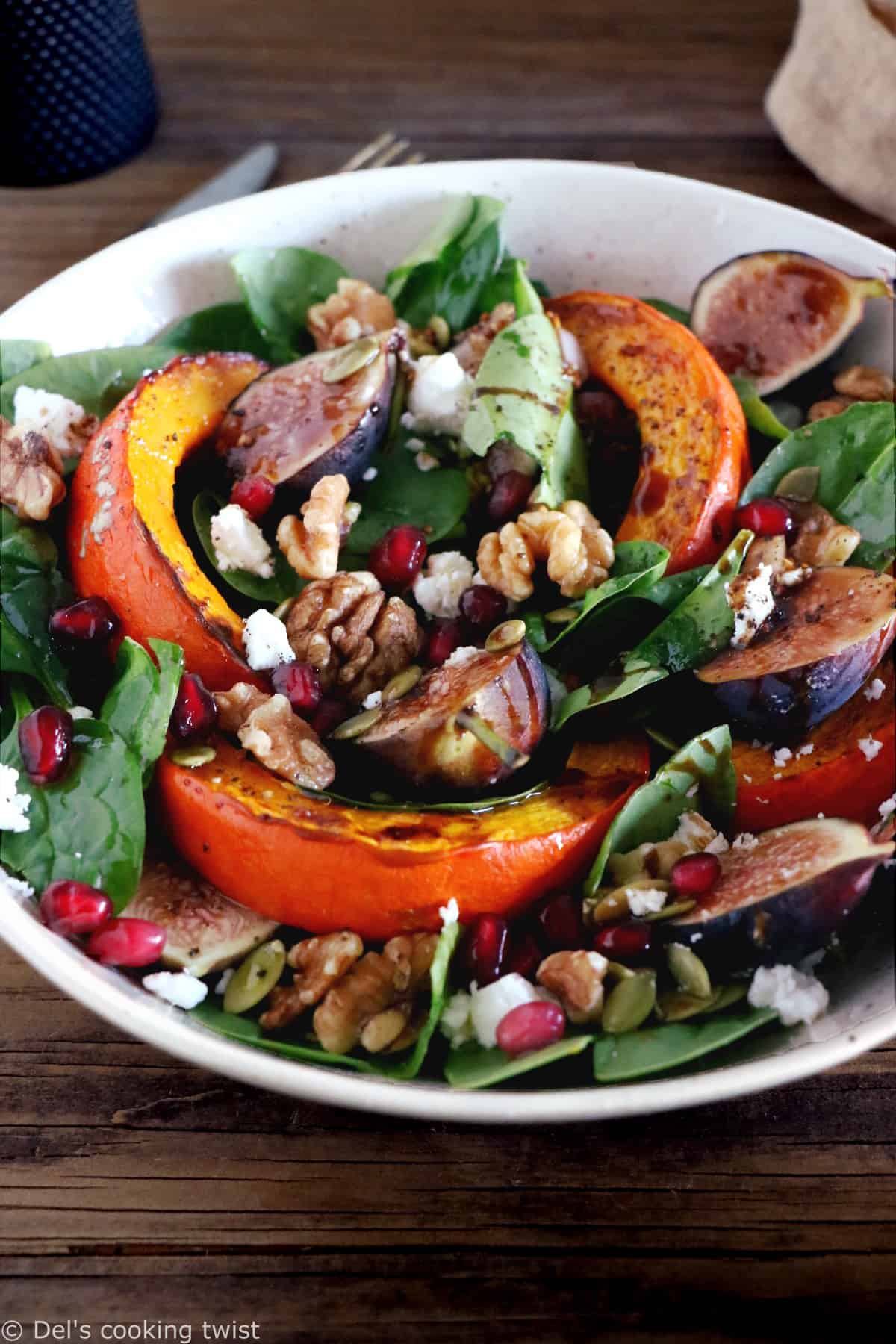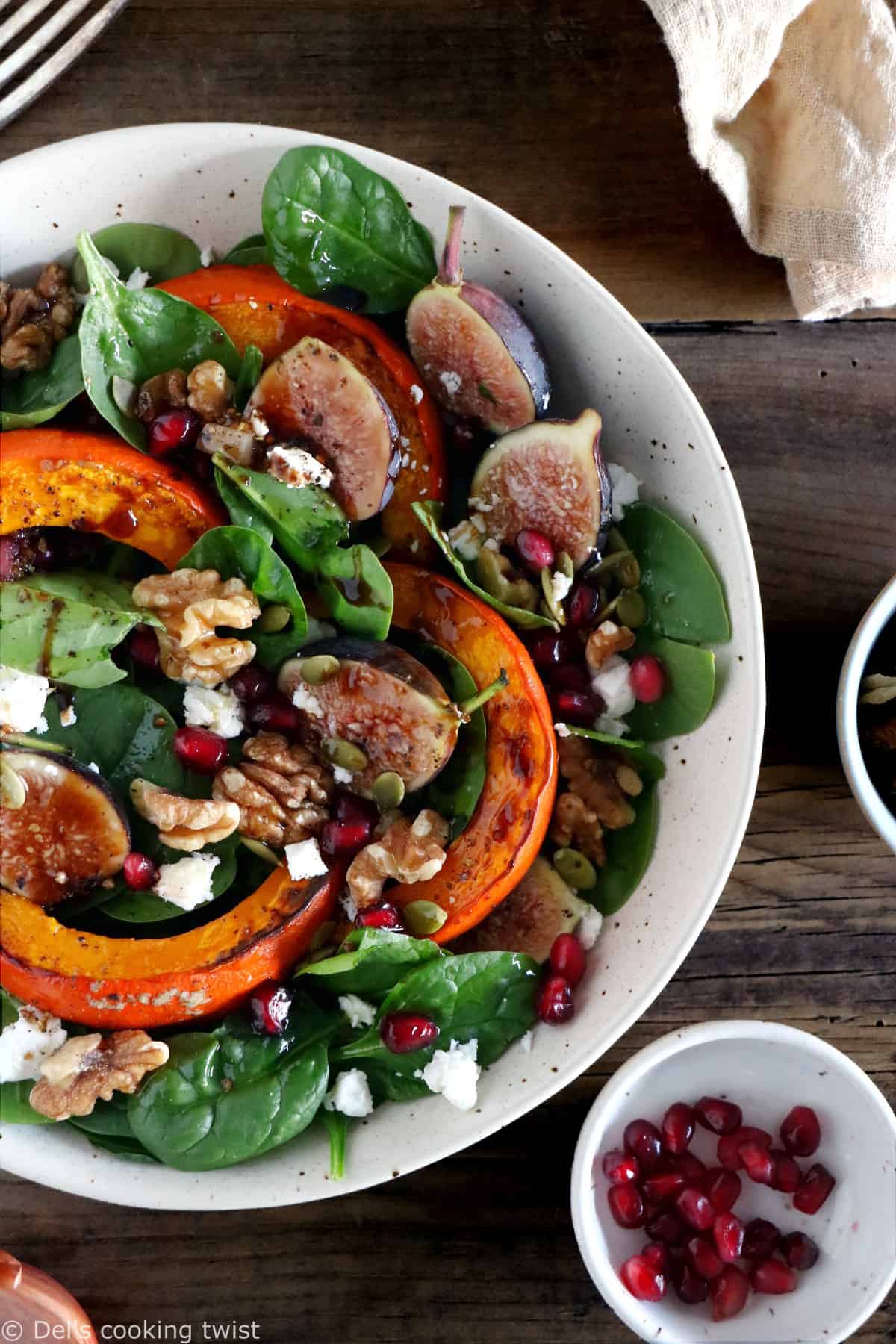 Quelques ingrédients suffisent pour réaliser cette salade aux saveurs automnales à la fois douces et réconfortantes. On y retrouve ainsi du potimarron, des pousses d’épinards, des figues fraîches, des noix et des graines de grenade. La vinaigrette est quant-à elle on ne peut plus simple, réalisée avec des échalotes émincées, de la moutarde en grains et bien sûr de l’huile d’olive et du vinaigre balsamique.
