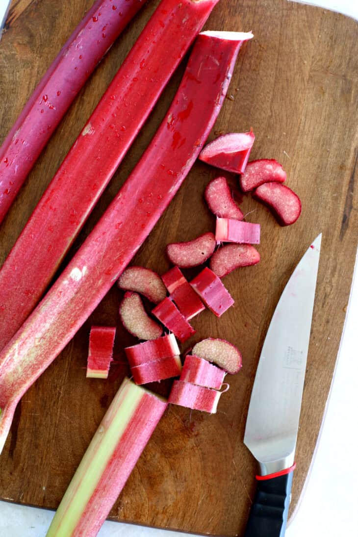 - Coupez les tiges de rhubarbe en petits morceaux de même taille pour une cuisson homogène et plus rapide. Pensez notamment au fait que la rhubarbe est ajoutée crue avant d’être enfournée.