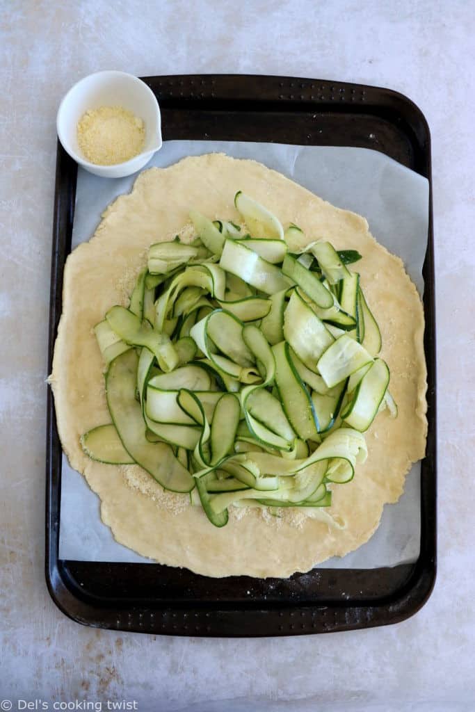 - Répartir le parmesan râpé sur toute la surface, en laissant une marge de 5-7 cm tout autour. Couvrir de rubans de courgettes, puis replier les bords de la tarte par dessus la garniture. Presser légèrement avec les doigts pour souder les bords qui s’entrevauchent entre eux.