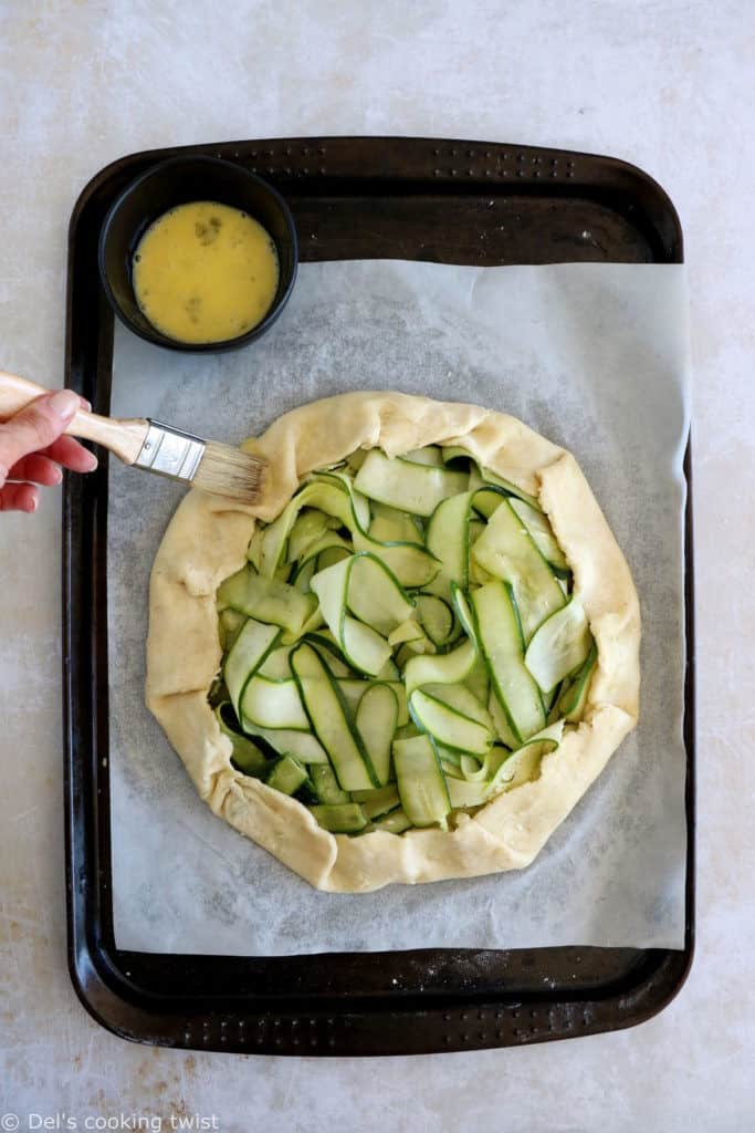 - Assemblez la tarte et enfournez. Commencez par étaler la pâte en un large disque, puis disposer la garniture, en commençant par le parmesan puis les courgettes, en prenant soin de laisser une marge tout autour. Repliez les bords, en les laissant s’entrevaucher, puis badigeonnez d’oeuf battu. Enfournez, puis arrosez d’un filet de miel par-dessus les courgettes.