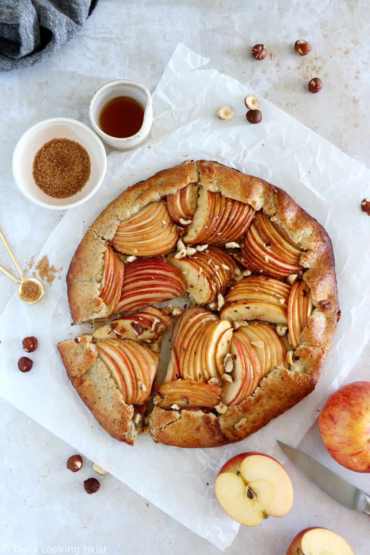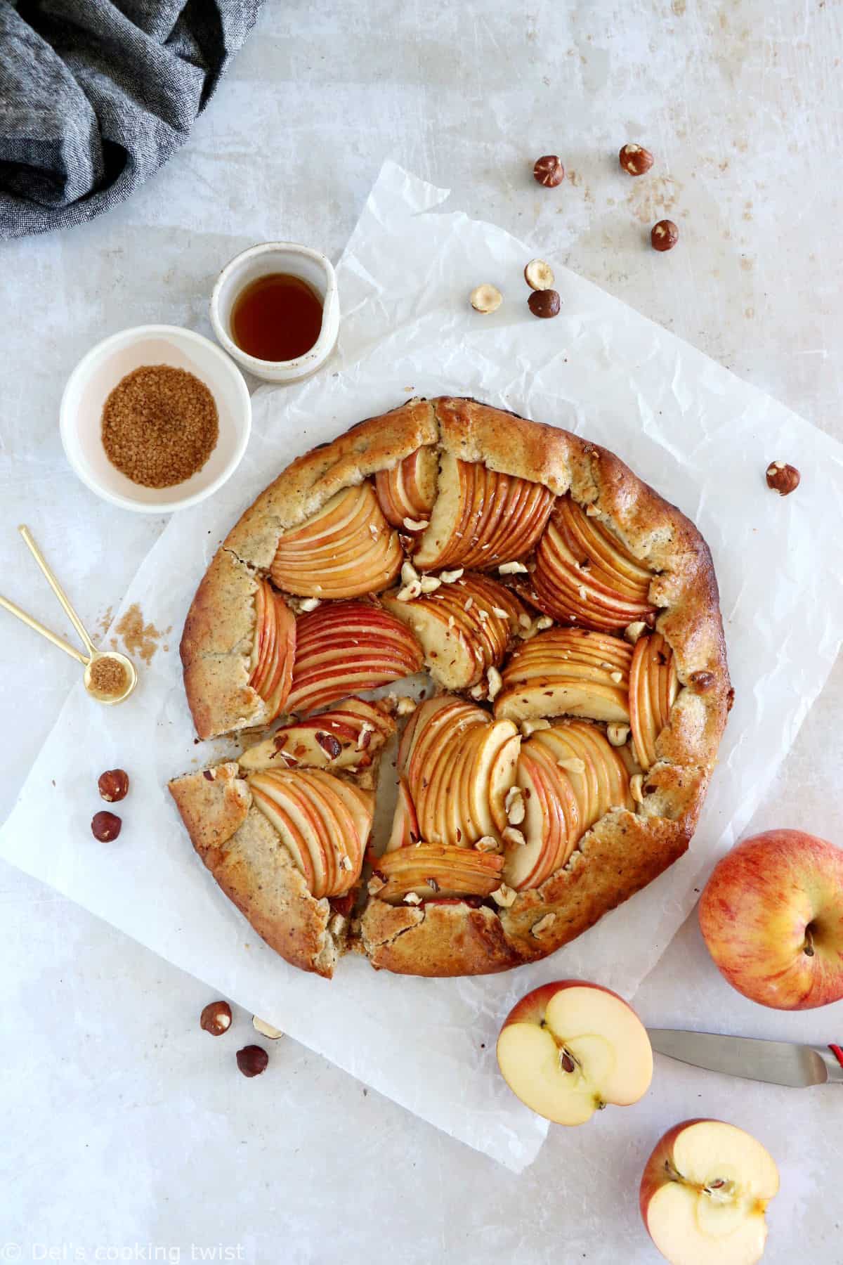 La tarte rustique aux pommes et aux noisettes est une tarte toute simple réalisée avec une pâte aux noisettes absolument irrésistible.