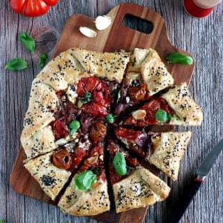 Cette tarte rustique, également appelée galette, est une version simplifiée de la tarte traditionnelle. Réalisée sur une plaque de cuisson plutôt que dans un moule à tarte, c’est une recette idéale pour les débutants en cuisine. Il suffit alors d’abaisser la pâte en un large disque, de la recouvrir de garniture (ici des légumes gorgés de soleil) et de replier les bords de la pâte par-dessus. Cette recette est inspirée de ma tarte tomates moutarde et ricotta mais dans une version qui cette fois allie saveurs douces et amères.