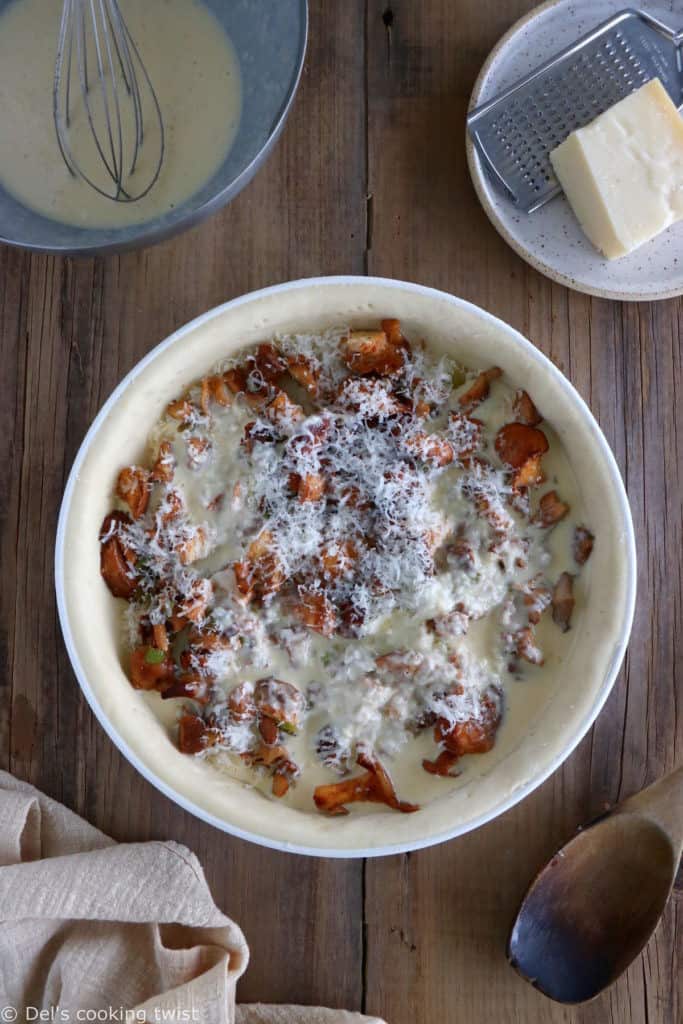 - Répartir la moitié du fromage râpé dans le fond de la pâte à tarte, ajouter les champignons, couvrir du reste de fromage râpé et verser le mélange d’oeufs par-dessus.