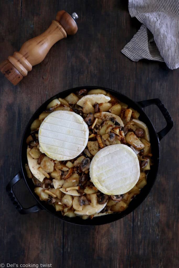 - Dans la même poêle, faites dorer les pommes de terre pré-cuites puis ajouter les champignons, l’ail, et faites-les revenir quelques instants.