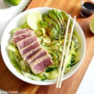 L’été est là, et cette semaine je vous emmène dans des destinations culinaires exotiques avec ce thon Ahi servi avec des tagliatelles de courgettes. Une recette relativement saine et pleine de fraîcheur, avec une légère pointe d’épices.