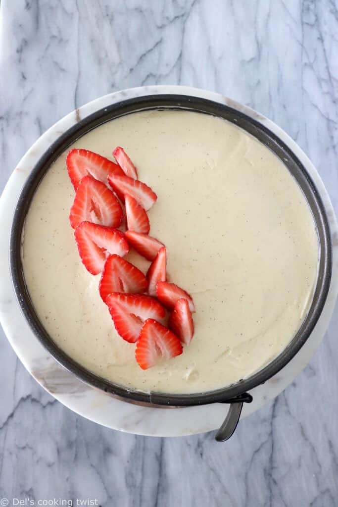 First thing first: keep in mind that a fraisier cake NEEDS to be prepared ahead of time, as the recipe requires about 4 to 6 hours chilling (or overnight) before serving.