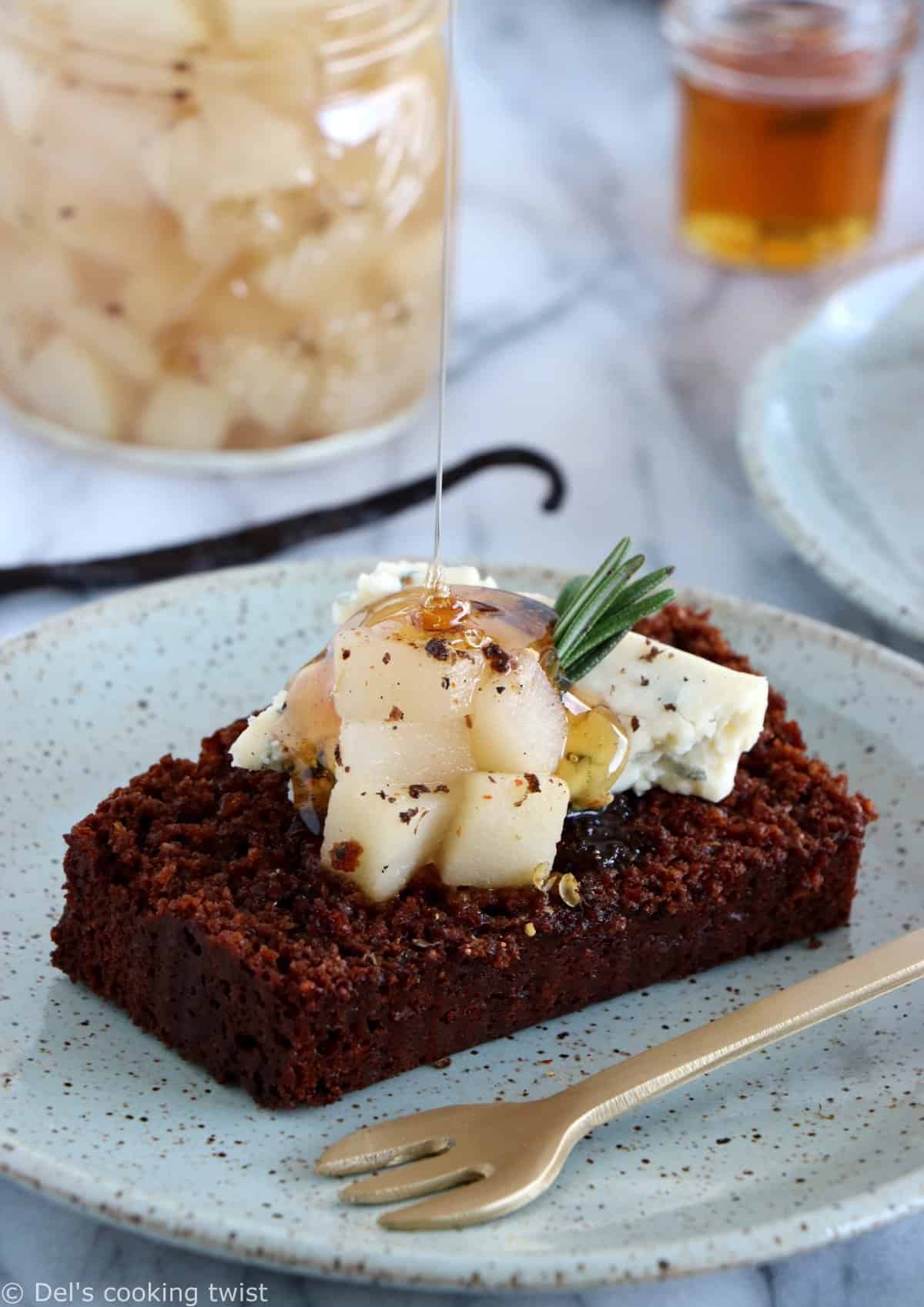 Thick, moist and generous gingerbread toasts topped with infused Timut black pepper pears and blue cheese. A beautiful sweet and savory appetizer for the holidays!
