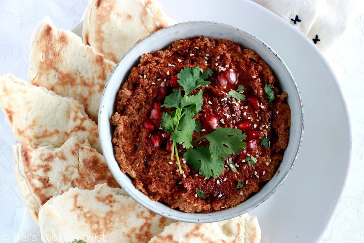 - In a food processor, pulse the walnuts until reduced into tiny pieces. Add the cauliflower florets, the harissa sauce and pulse until smooth. Add a little bit more water if too thick, and taste to adjust seasoning. Refrigerate for about 15 minutes and serve along with pita bread.