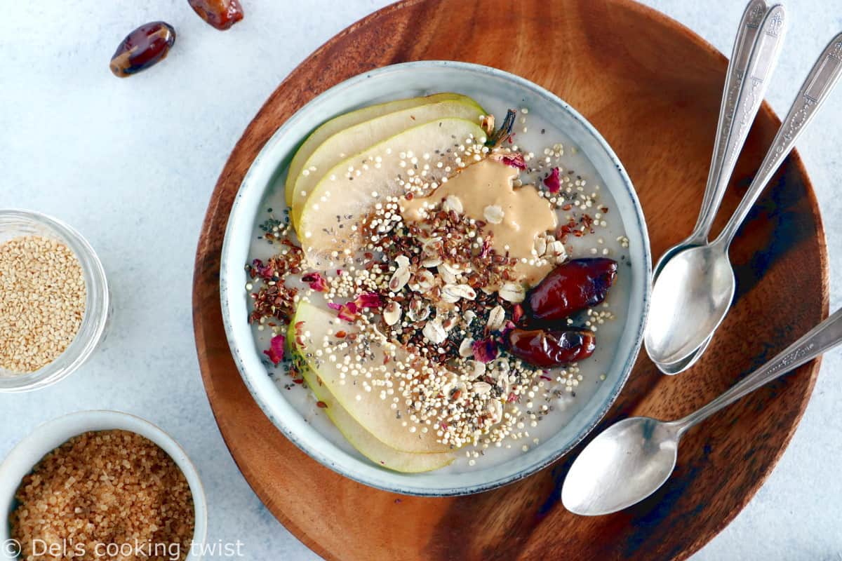 - Divide equally between two bowls. Spoon cashew butter and ½ sliced pear over each serving, then sprinkle sesame on top and add a few dates if desired. Grind flaxseed at the last minute over each bowl, and enjoy!