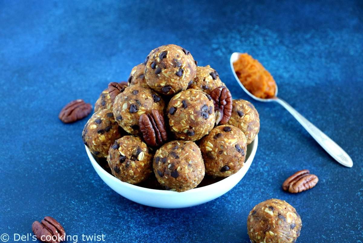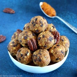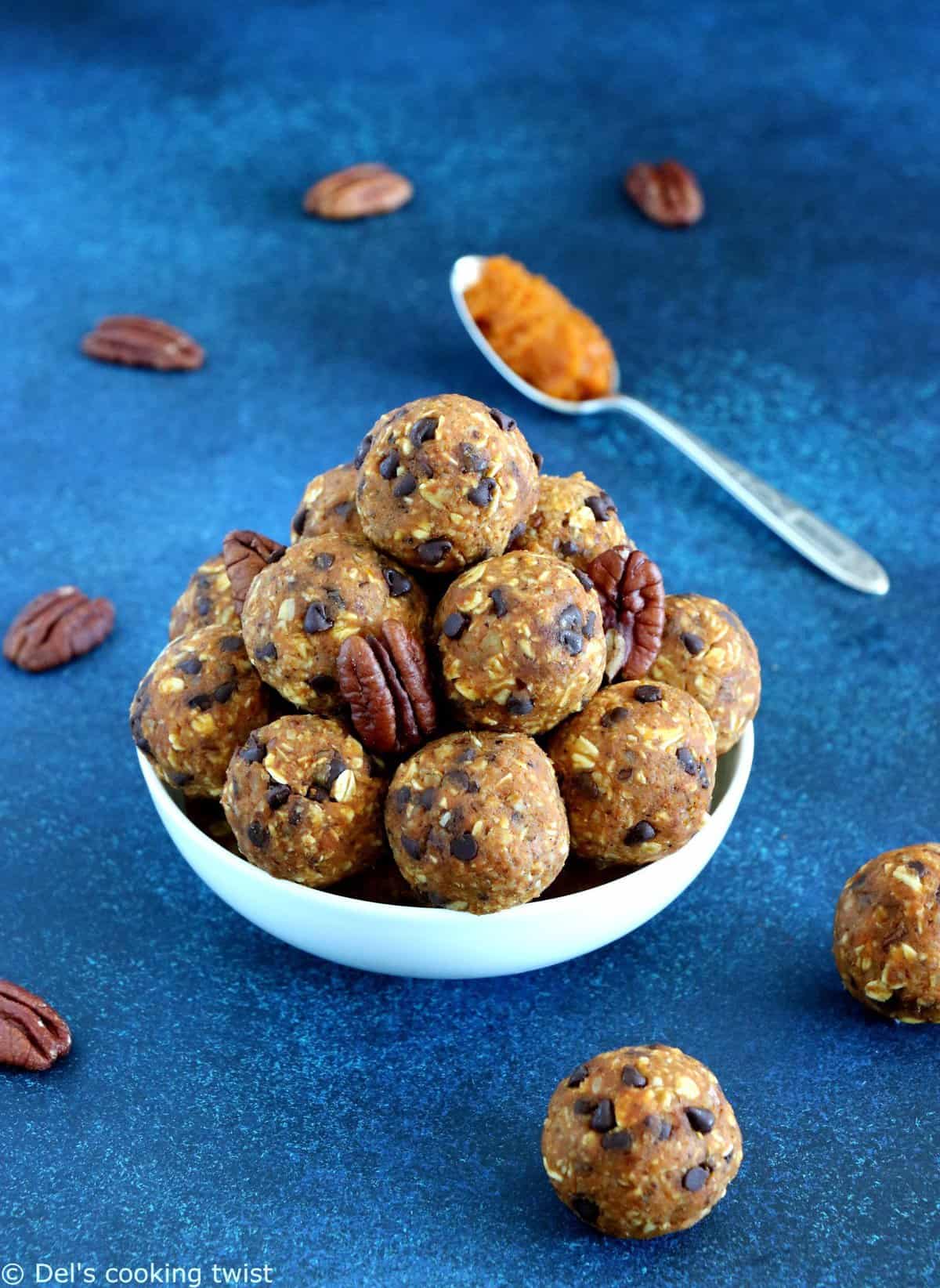 Healthy energy bites bursting with pumpkin pie flavors. Vegan and gluten free, they make a perfect seasonal snack to take with you on any occasion.