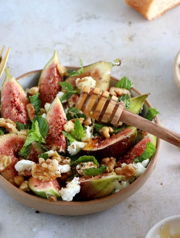 - To assemble: top every two eggplant slices with some goat cheese. Add walnuts, and sprinkle crushed garlic, herbs, chili flakes, salt and pepper. Drizzle some honey on top and cover with the remaining eggplant slice.