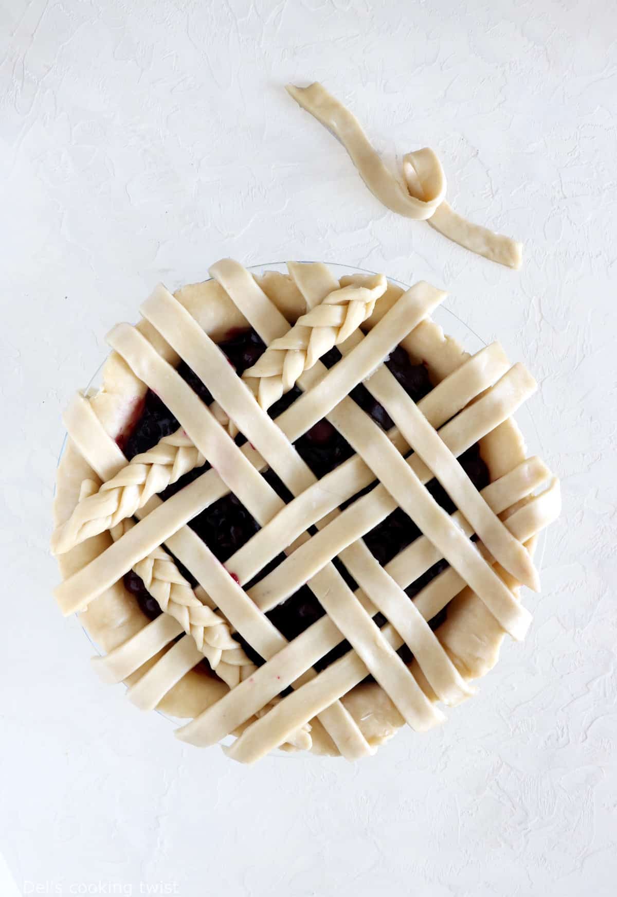 When it comes to weaving a pie, you need a strong pie crust, easy to handle. This is the only way you can guarantee the strips of dough will hold their shape when weaving the design on top of your pie. My go-to recipe is my all-butter pie crust, a recipe I created a few years ago for my Classic Apple Pie.