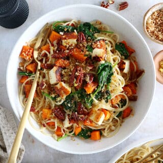 Up your pasta by making this lemony winter squash pasta with halloumi, baby spinach, and a crispy pecan-breadcrumb. Topped with halloumi croutons, it makes a delicious and satisfying vegetarian pasta dish everyone loves!