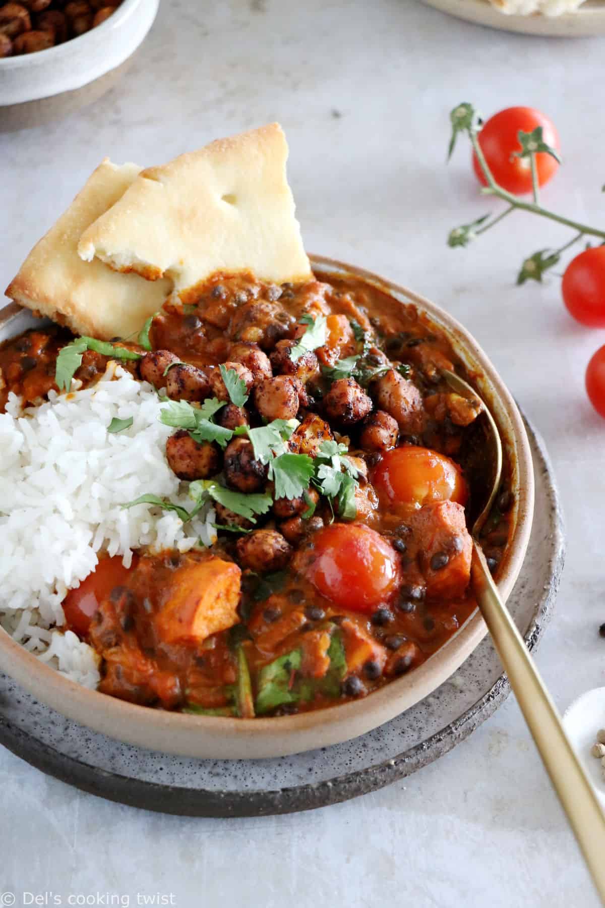 This lentil, chickpea and sweet potato curry is a little twist to my cauliflower curry recipe. Loaded with nutritious ingredients, and subtly flavored with Indian spices, it makes a very satisfying and healthy weeknight meal.