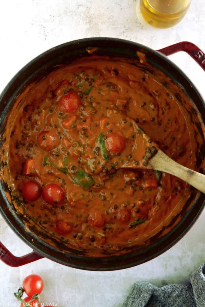 - Finally, add the coconut milk, lentils, spinach, and roasted sweet potatoes, and mix until everything is combined and heated through, about 5 minutes.