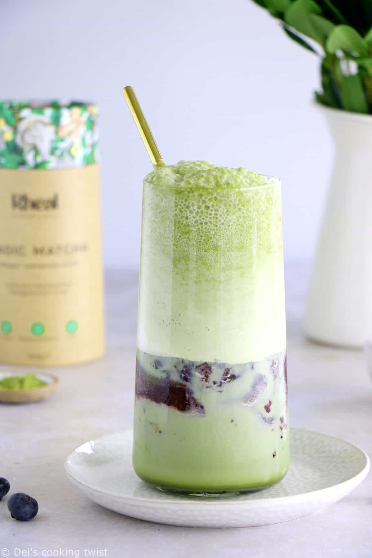 What about the blueberry swirl? You can make this matcha frappuccino with or without the blueberry swirl. If using it, simply blend the blueberries with agave syrup and a few spoonfuls of water until relatively smooth. You can do this using fresh or frozen blueberries. Ideally, I recommend covering the blueberry layer with crushed ice in the glass, then add a few spoonfuls of the iced milk texture as a middle layer. Lastly, pour the matcha frappuccino and top it off with the foam. Enjoy!