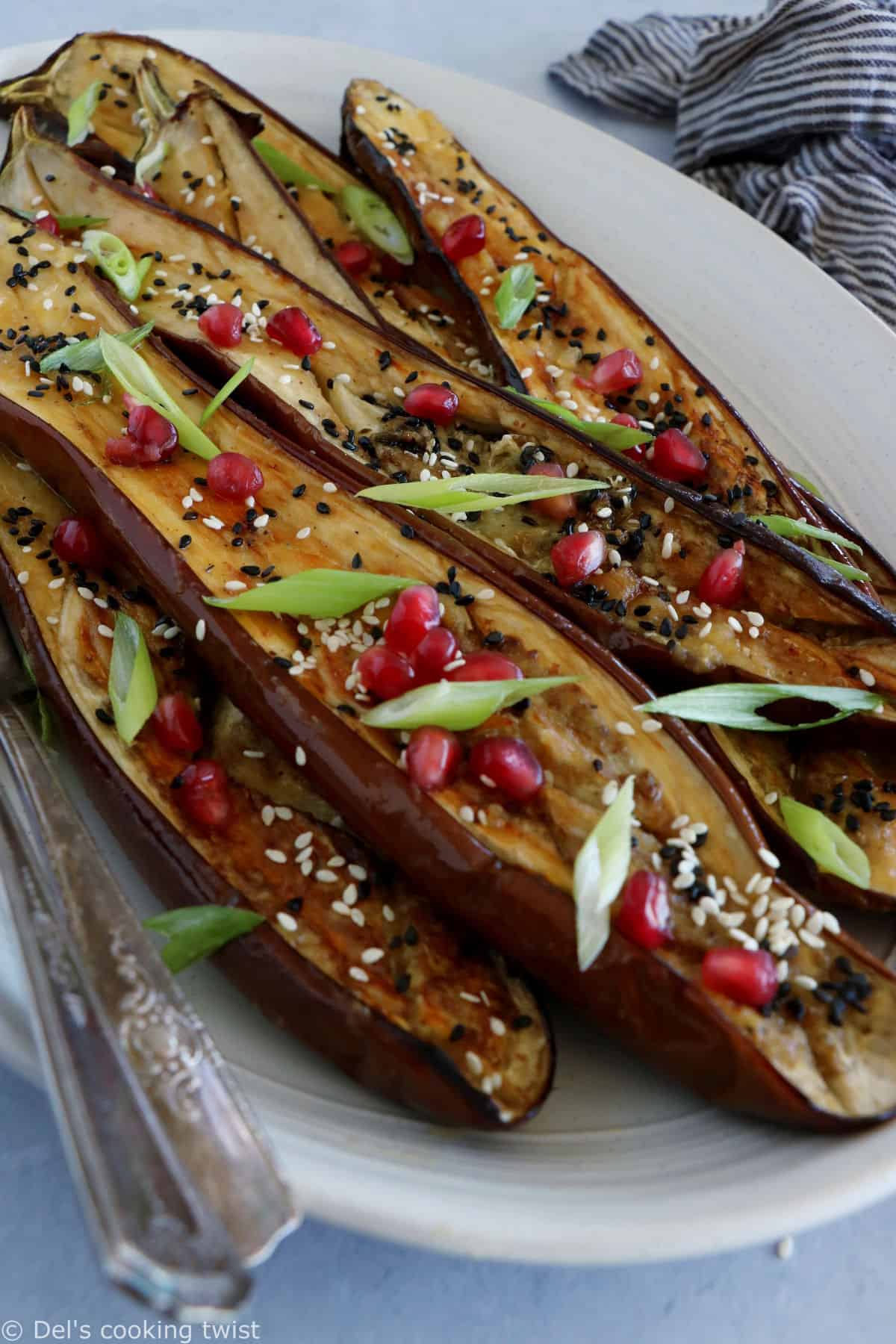 - Drizzle the eggplants with the remaining miso glaze, sprinkle sesame seeds on top, and garnish with pomegranate and spring onions. Enjoy!