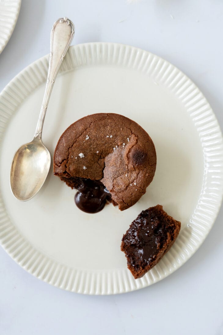 IMPORTANT! Keep in mind that the baking time can vary from one oven to the other. To ensure your lava cakes have the right doneness, slightly touch the top with your fingers. The texture should be set on the sides and still slightly jiggling in the center. Make a few tests to figure out your own baking time for the right texture (usually 2 mins apart for the melting center or more baked center).