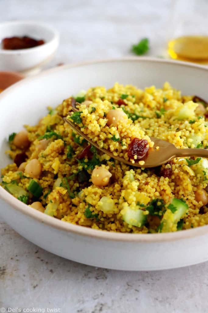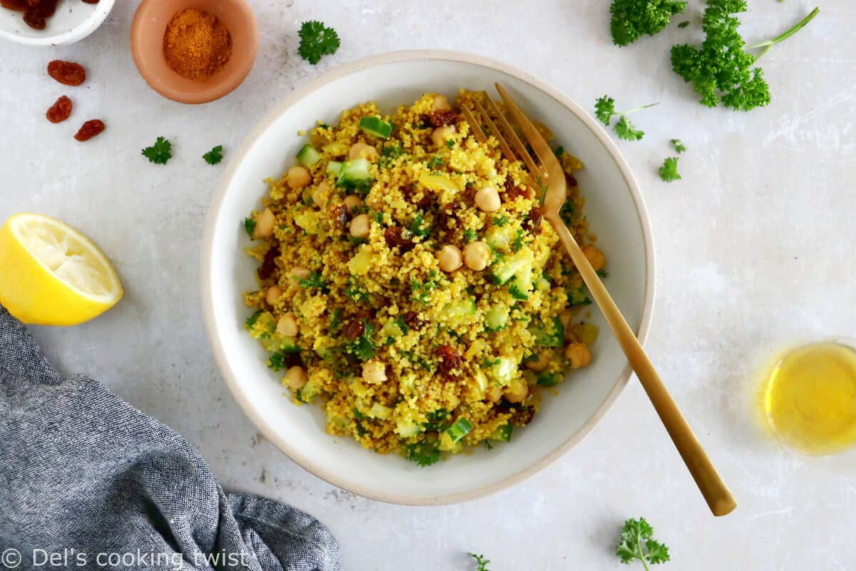 This Moroccan-inspired chickpea couscous salad consists in a delicious couscous flavored with ras el hanout, golden raisins, chickpeas and fresh herbs. A quick salad recipe that packs a punch!
