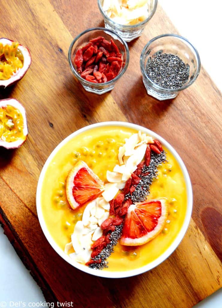 This exotic version with mango, blood orange juice and passion fruit is one of my favorite. It makes a healthy breakfast: with no cholesterol, this smoothie bowl is high in dietary fiber, high in vitamin C and B6, while the superfoods are a good source of antioxidants. Ready in 5 minutes only, you have no excuse to skip breakfast anymore. This smoothie bowl that will brighten up your day!