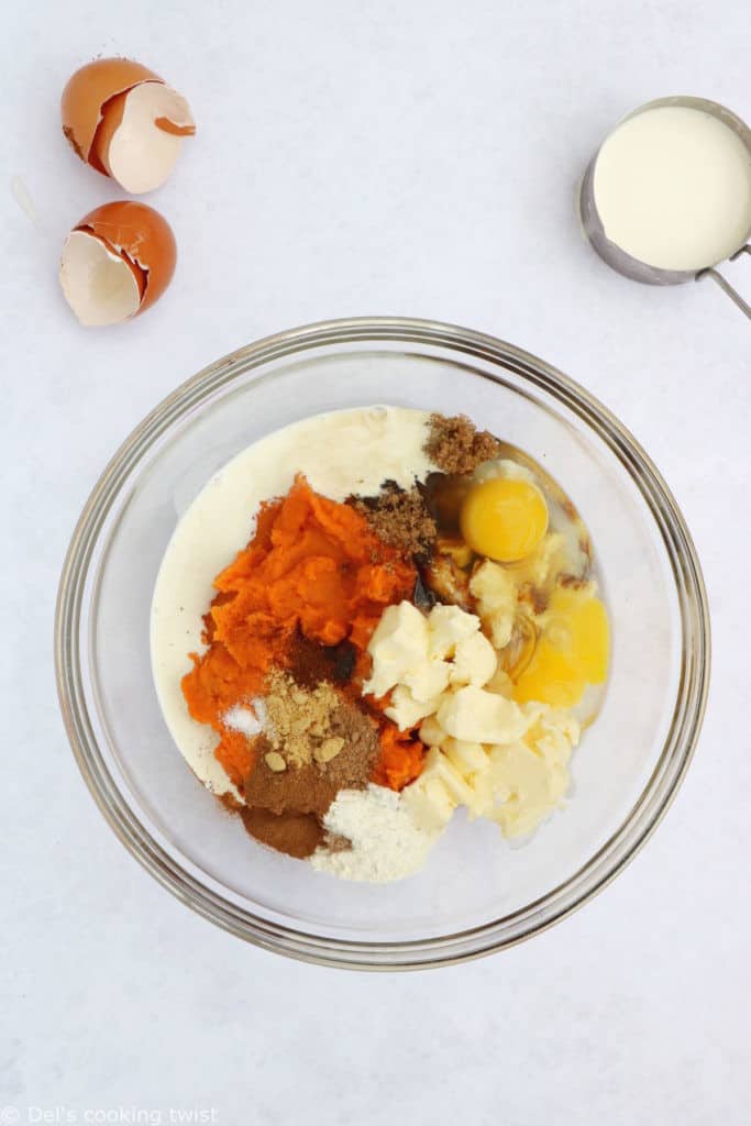 - Combine the filling ingredients. It doesn’t get any easier than this! All you need is an electric hand mixer to beat together all the filling ingredients until smooth. Note: I like to mash the sweet potatoes with a fork first, but it is not necessary.