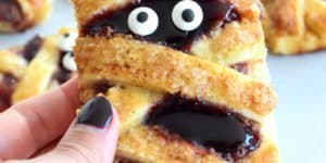 These mummy hand pies are a perfect baking activity to make with your kids prior to Halloween. Feel free to either go for this delicious PBJ filling, or replace it with chocolate spread. If you go for the latter option, I recommend you try my Chocolate Hazelnut Spread “Newtella”, much better and healthier than the leading brand company. Whatever you decide, don’t forget your candy eye balls: they will give eye-catching personality to the mummies. You can easily order them online or find them at the candy section of your grocery store this time of year. Happy Halloween!