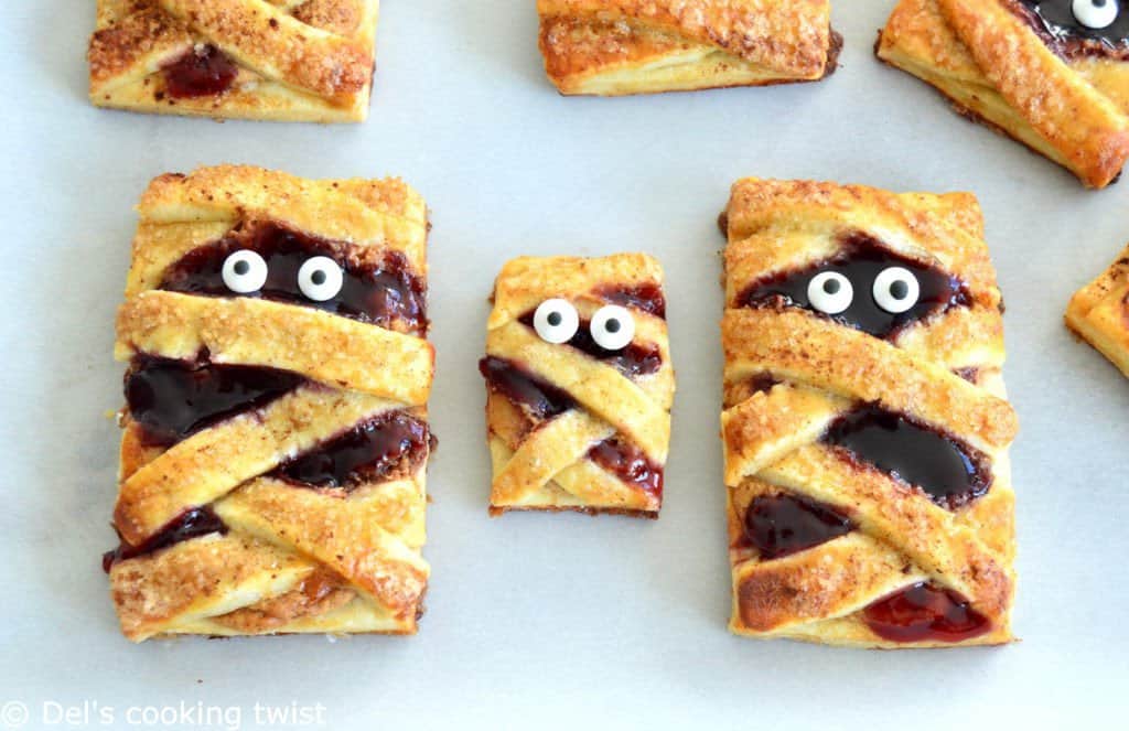 Note that you can also make these mummy hand pies in a savory version, looking like mini pizza. Simply replace the sweet PB&J filling with tomato paste with herbs, salt and pepper, and use sliced black olives for the eyes. I tried, it’s bloody good!
