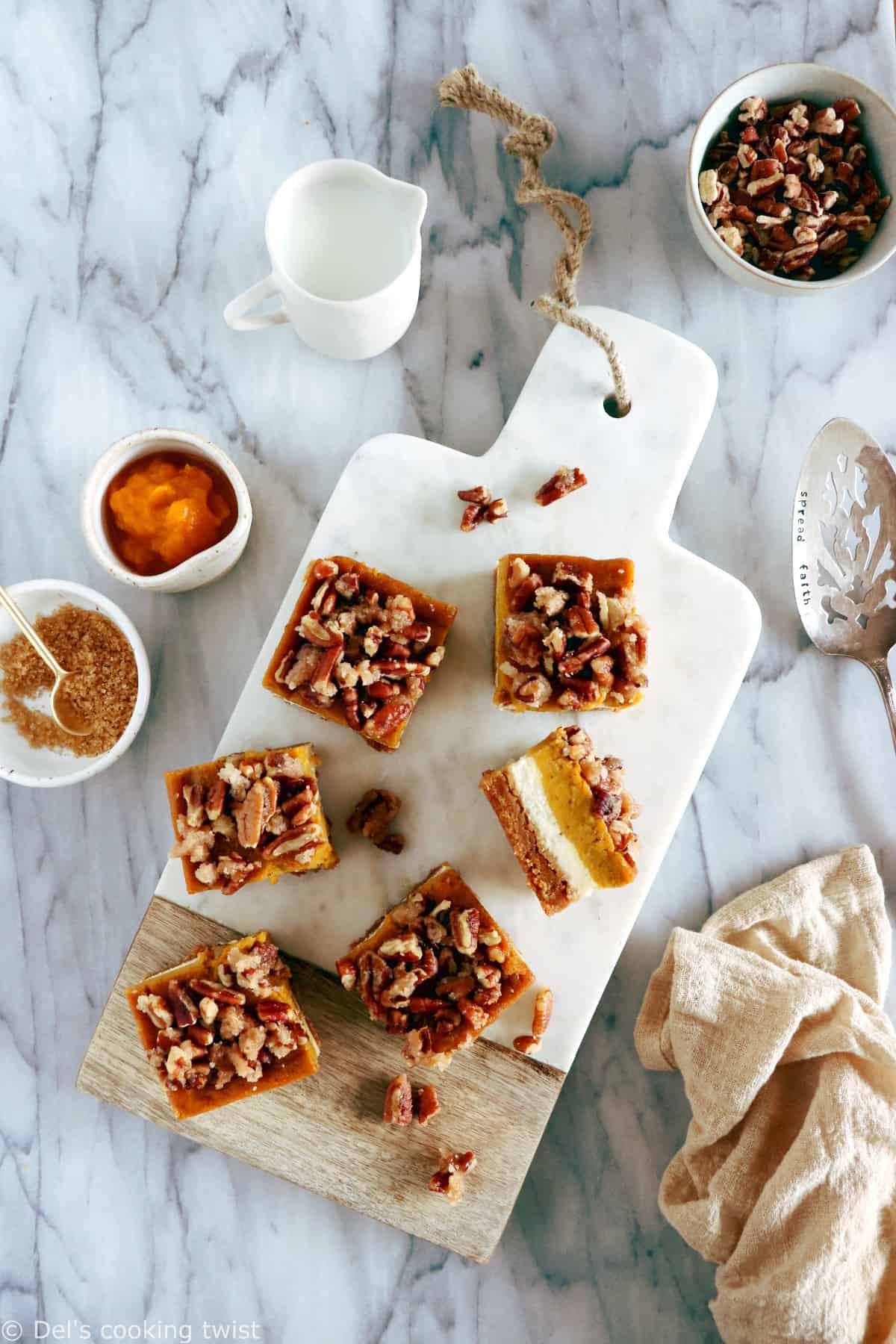 If you can’t decide between a pumpkin pie, a cheesecake or a pecan pie for your Thanksgiving party or for Christmas, these bars will save you and make everyone happy! And the best part, which is hard to believe when you see all these layers stacked on top of each others: these bars are incredibly quick and easy to prepare and assemble. I once started the recipe at 9:30pm and had the dessert ready even before I went to bed. I let it cool overnight, and had it for dessert the following day!