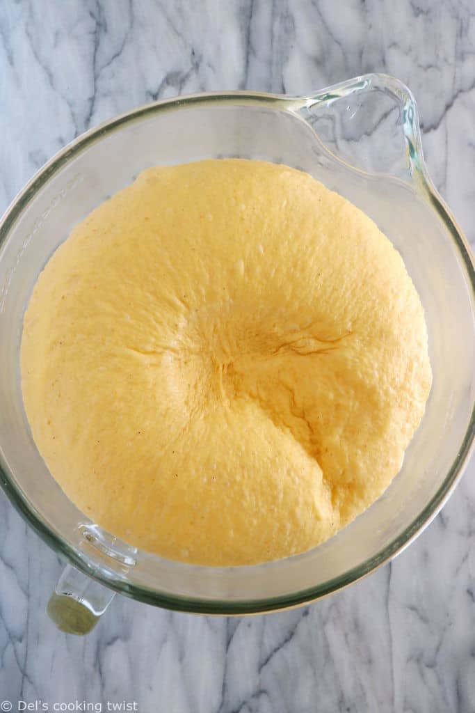 J’ai eu également trop de liquide dans la pâte, de plus 2 cas de levure de boulangerie me paraît un peu trop non ?. La pâte s’est mise à gonfler et à déborder du récipient…