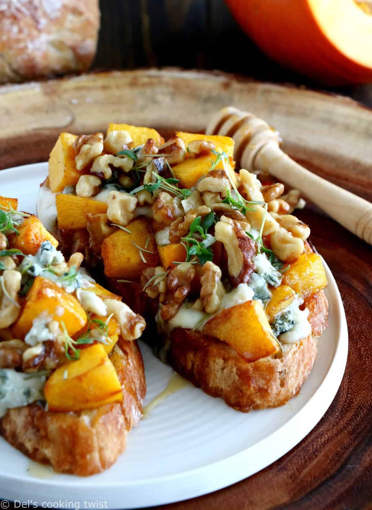 Gather up the bounty of fall with this pumpkin, walnut and blue Cheese bruschetta. This harvest-inspired dish makes a perfect appetizer or side dish to a cozy soup for a lazy weeknight dinner.