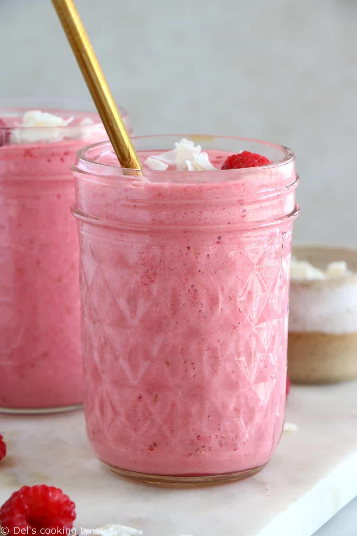 This beautiful raspberry coconut smoothie is deliciously sweet and tart at the same time, with a subtle tropical touch brought by the coconut milk. A quick, healthy smoothie, with a vibrant color.