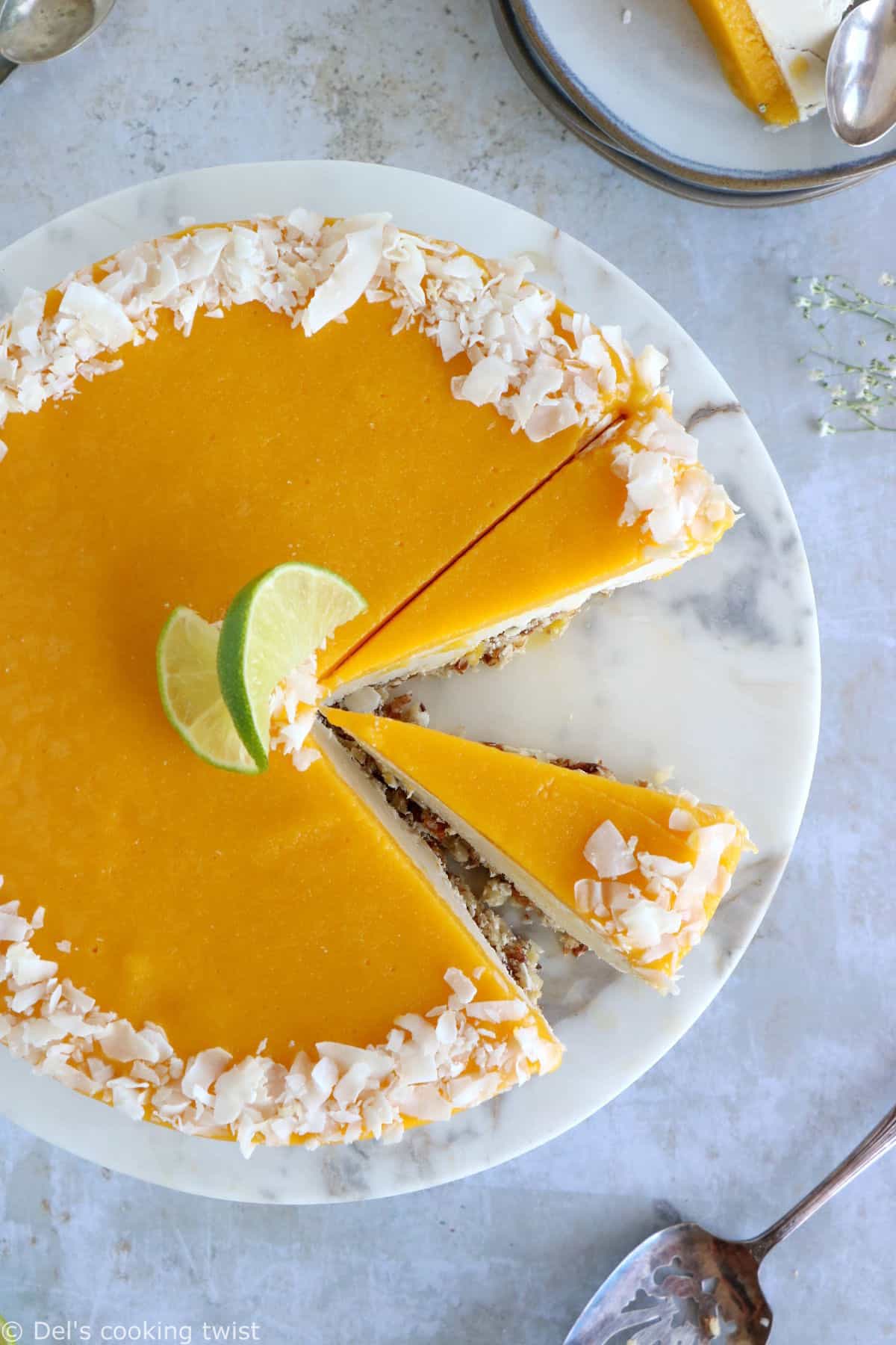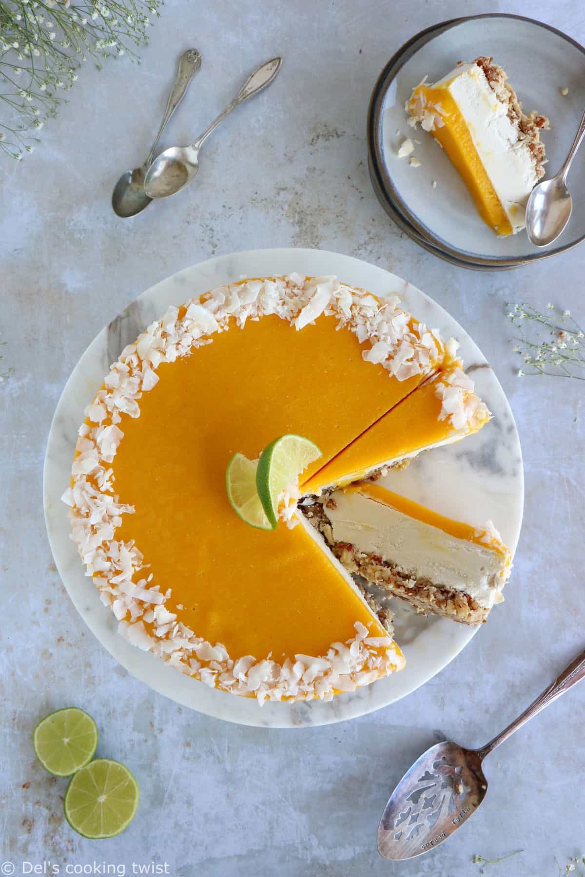 Quel superbe visuel ! et puis la noix de coco est un peu le chouchou chez moi en ce moment (et peut-être même plus en salé qu’en sucré !) En tout cas le fond est à tomber ! Ainsi préparé, ce cheesecake promet des saveurs coco-mangue-citron vert saines et gourmandes !